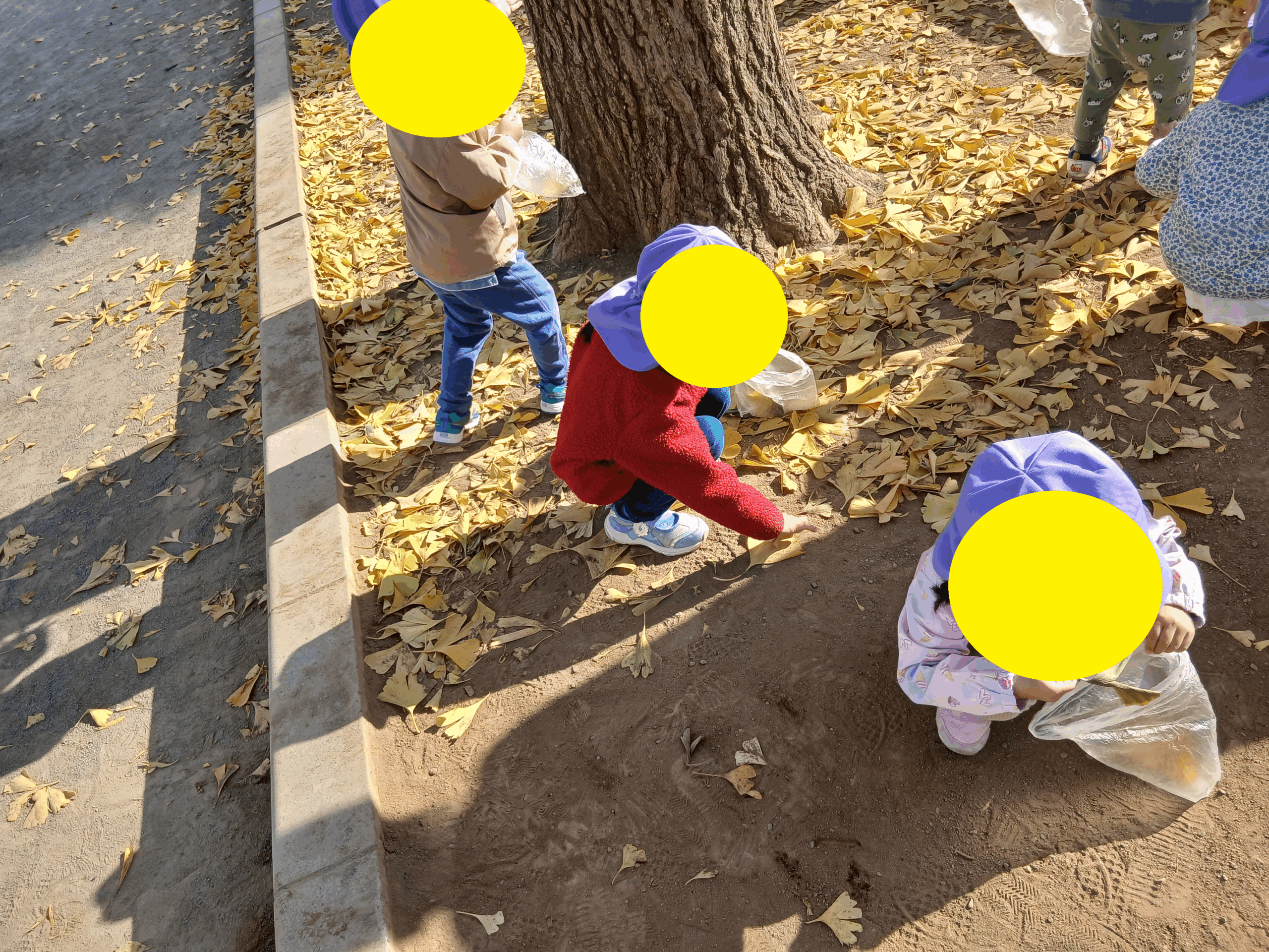 2025.11.28 3歳児 イチョウ拾いをしたよ🍂 もも組さんは、土呂公園に行ってイチョウ拾いをしてきました😊 「ハートの形になってて可愛いね!」とお友だちとお話をしていました🤭たくさんイチョウを拾った後には、鬼ごっこをしている子もいたり、松ぼっくりを探しているお友だちもいたりしましたよ😆⭐ -