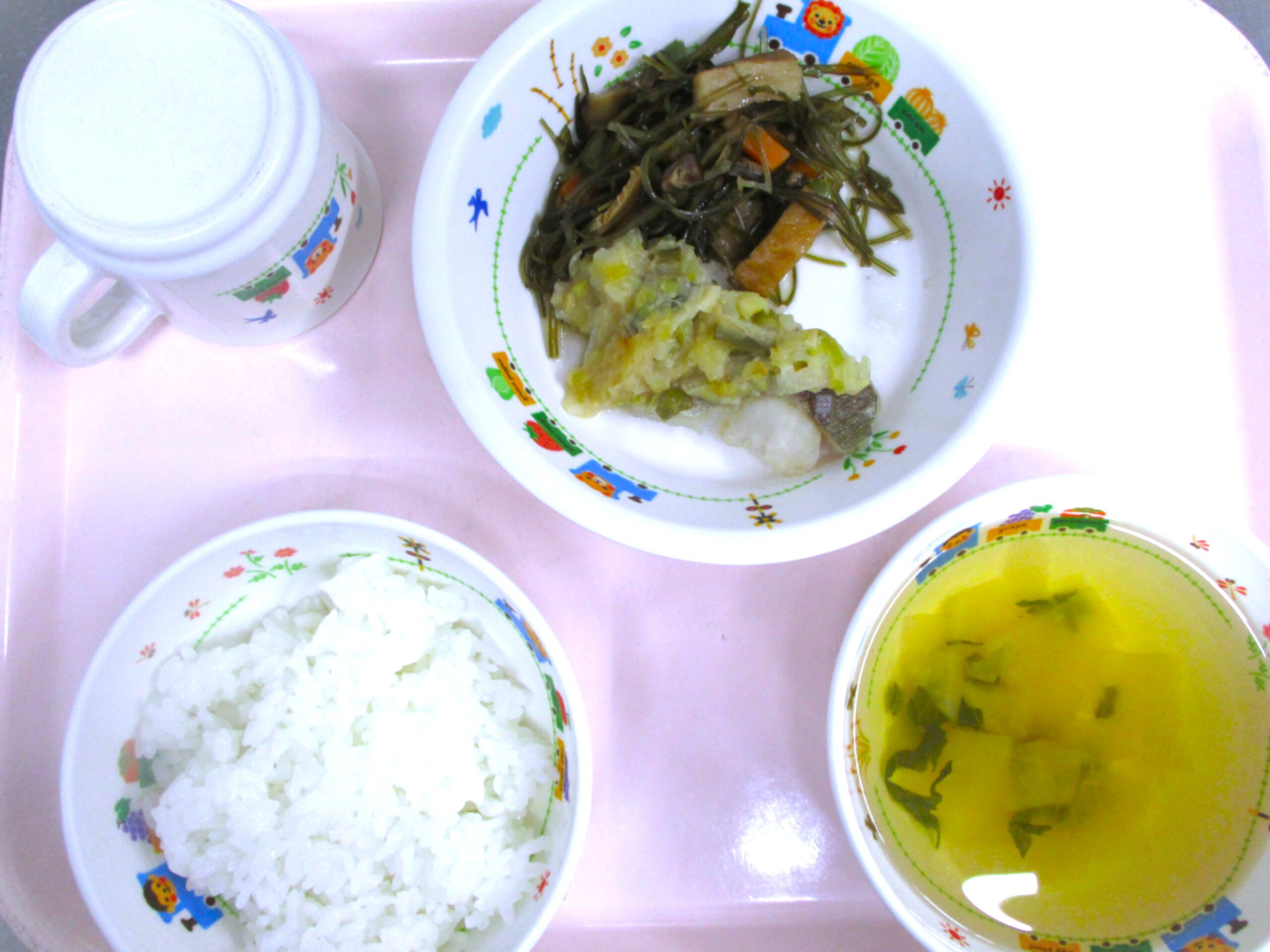 2025.12.08 🐟たらのネギみそ焼き🍽️ 🌈大宮たんぽぽ保育園 🍴今日の給食 🍚ごはん🍚 大根のすまし汁 たらのネギみそ焼き 切り昆布の煮物 いただきます。 -