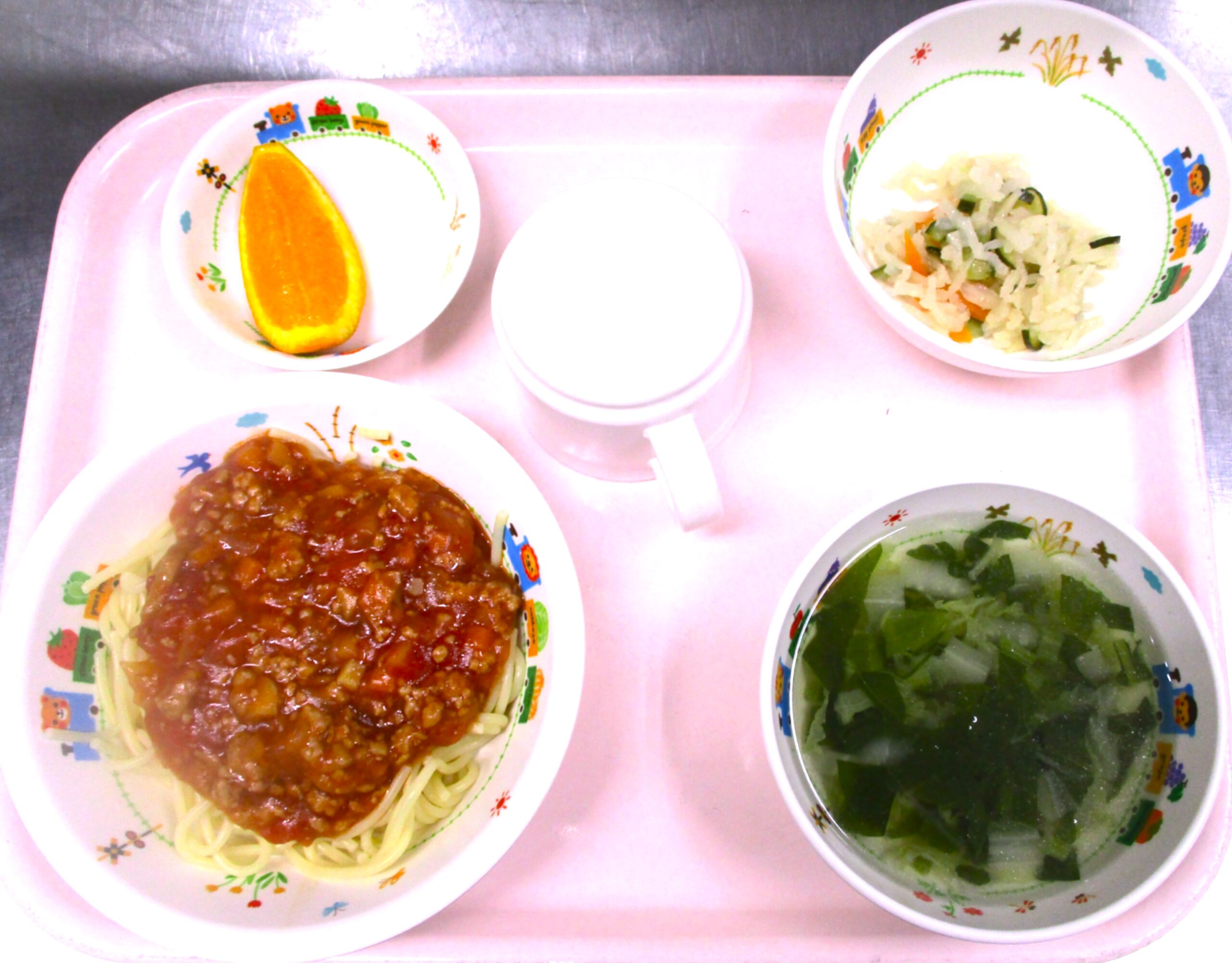 2025.11.13 🍝ミートソーススパゲティ 🌈大宮たんぽぽ保育園 🏫今日の給食 🍝ミートソーススパゲティ 🍲はくさいのスープ 切干大根の🥗サラダ 🍊オレンジ いただきます。 -
