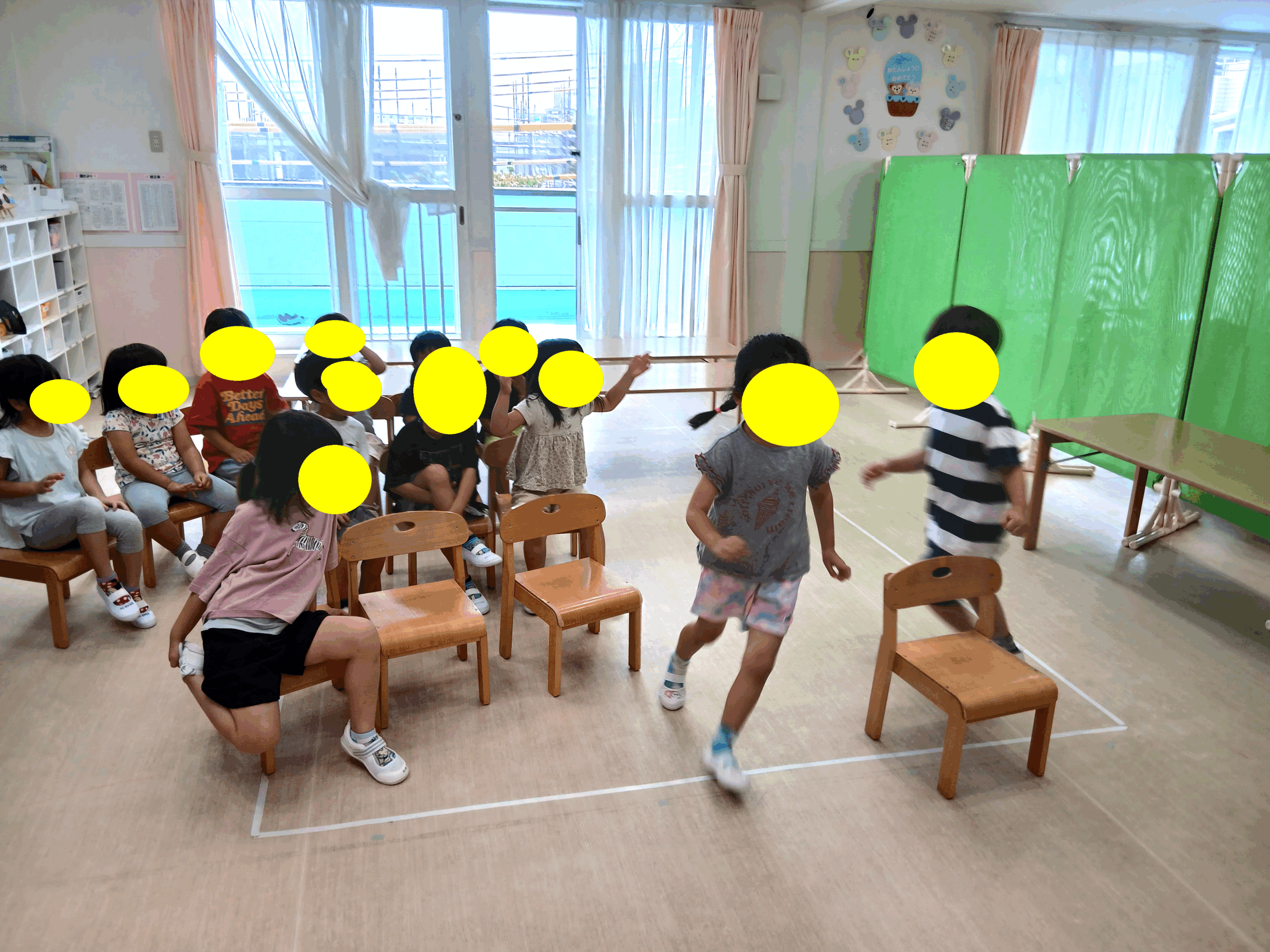 2025.09.01 集団遊び(椅子取りゲーム🪑) 大宮たんぽぽぽ保育園 年中クラスのなつめ組さんでは、室内遊びの時間に集団遊びを取り入れています! 今回は、子どもたちが大盛り上がりな椅子取りゲームです🪑‼️ 流れている音楽を聴きながら踊ったり歌ったりしつつ楽しそうに椅子の周りを回っているかわいいなつめ組さんですが、音楽が止まると