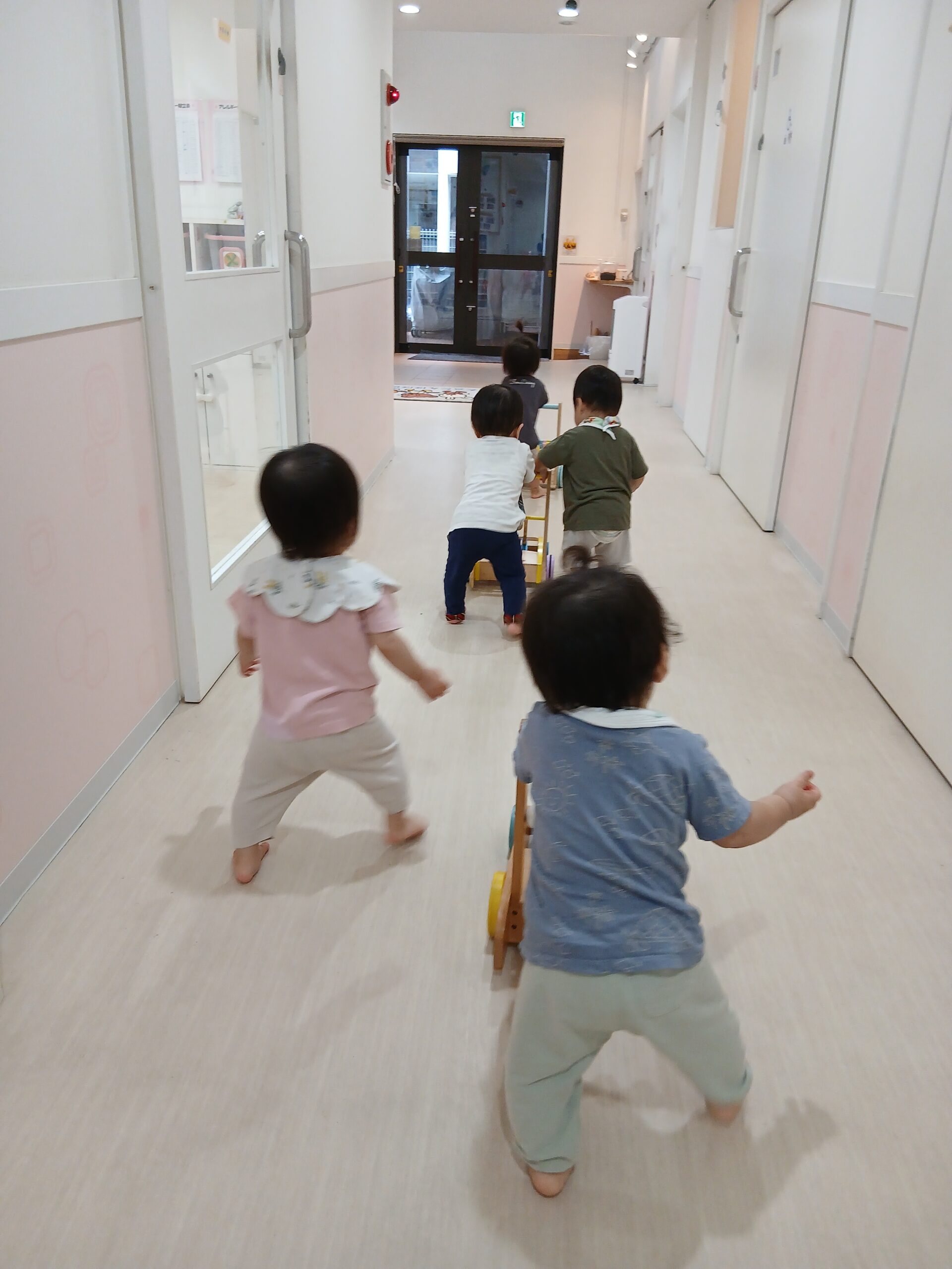2025.09.05 0歳児くるみ組 あんよが上手になりました! 今月でクラスのみんなが1歳になるくるみ組さん♡ ハイハイ、伝い歩き、あんよ…とそれぞれの遊びを楽しんでいます♪ 今日は廊下に出て、手押し車でお散歩を楽しみました☆ カタカタ、トコトコ♪あんよ練習中のお友だちも自信満々な笑顔で歩いている姿が可愛らしいです💕 -