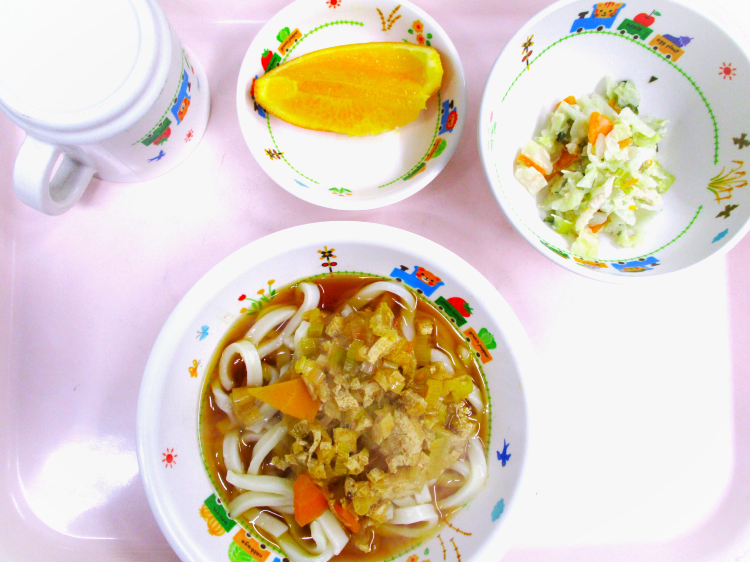 2025.09.04 きつねうどん 🌈大宮たんぽぽ保育園🏫 今日の給食🍽️ 🍜きつねうどん🥕🧅 蒸し鶏の🥗サラダ 🍊オレンジ🍊 いただきます。 -
