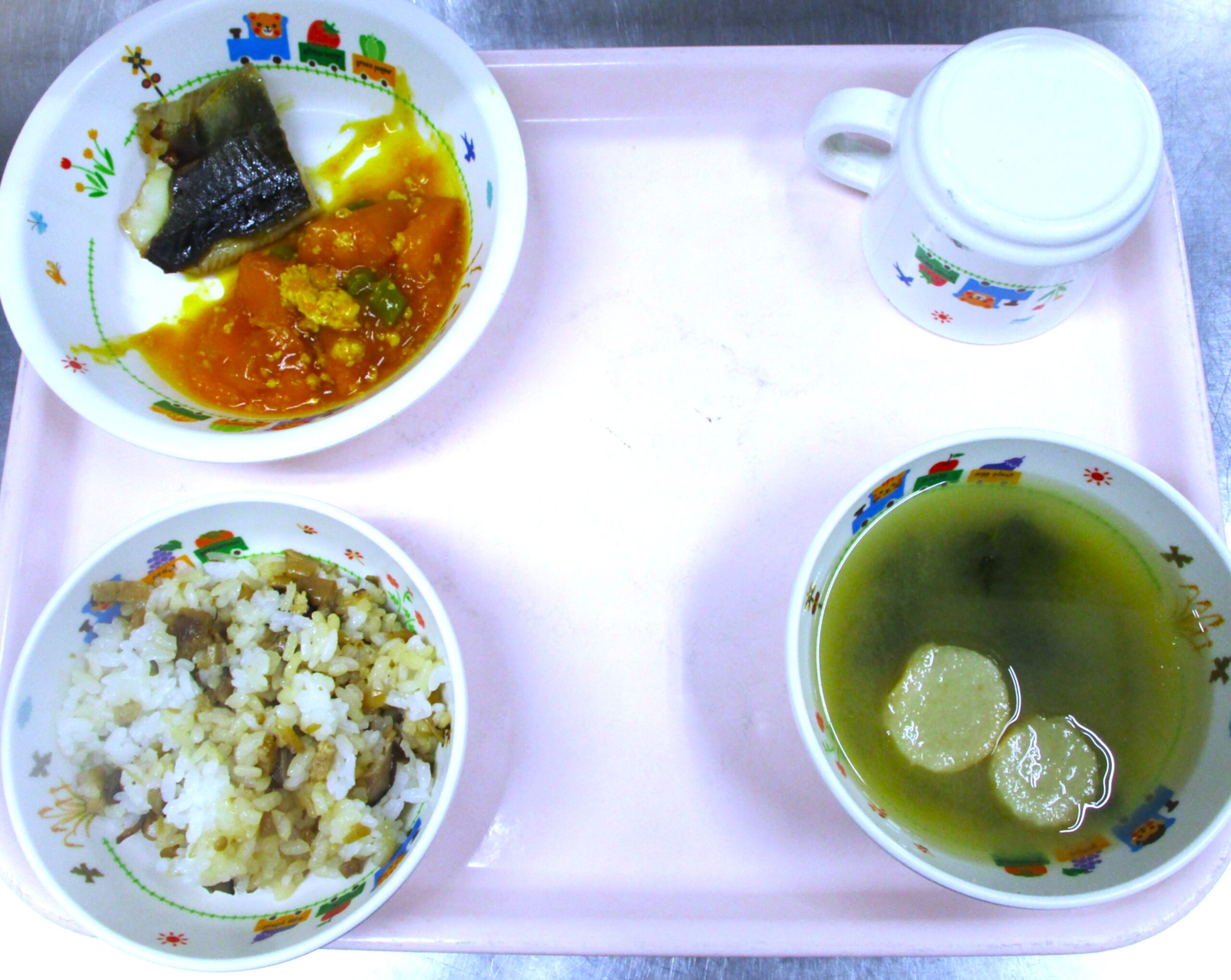 2025.09.08 きのこ🍚ごはん 🌈大宮たんぽぽ保育園 🍽️今日の給食 きのこごはん みそ汁 ほっけのみりん焼き かぼちゃのそぼろ煮 いただきます -