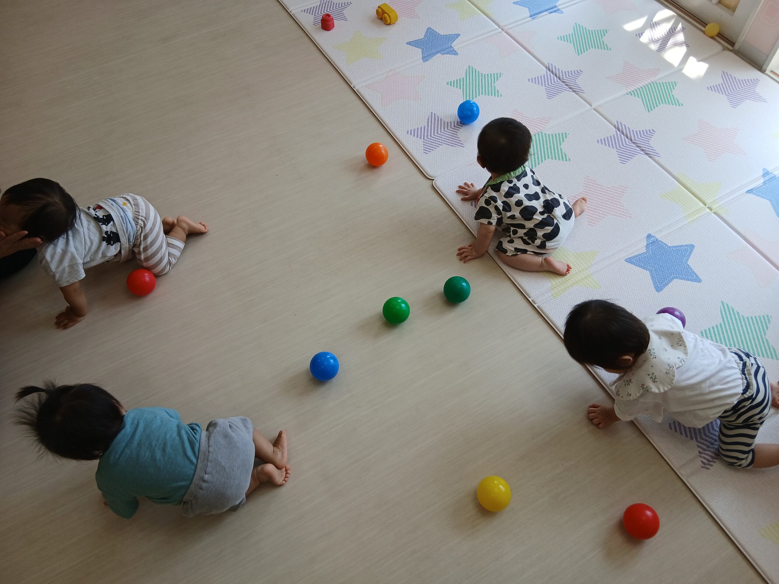 2025.08.20 0歳児 くるみ組 ボール遊び 今日のくるみ組さんはお部屋でボール遊びをしました☆ たくさんのボールを出すとみんな笑顔で手を伸ばしてきたくるみ組のお友だち! 先生にコロコロ~っとボールを転がしてくれたり、ボールがあるところまでハイハイをして手に持ってみたりしてたくさん遊びました♪ -
