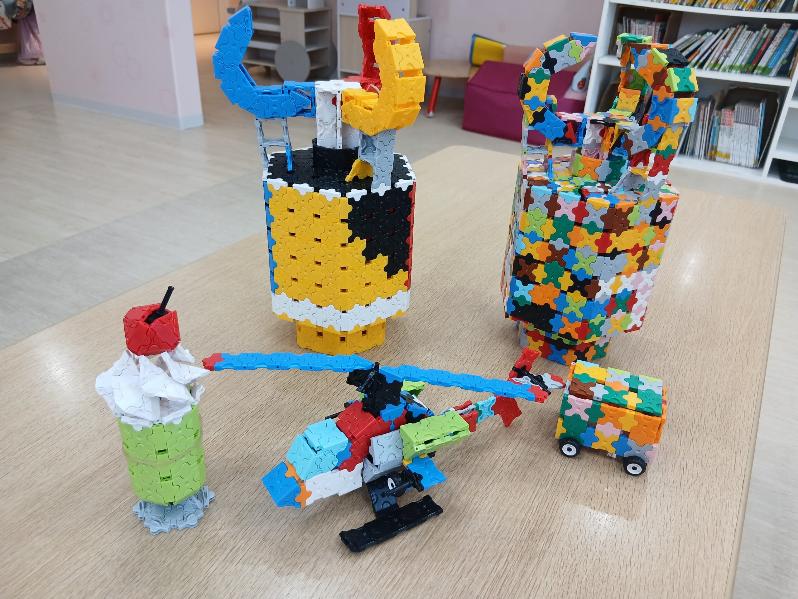 2025.08.21 こんなの作れるよ! 大宮たんぽぽ保育園 かりん組さんで一番好きな玩具は何?と聞いてみると必ず声が挙がる玩具、ラキュー! 今日は、かりん組さんイチオシの作品をご紹介したいと思います! キャッチャーアームとヘリコプター・それからメロンソーダです♪ み -