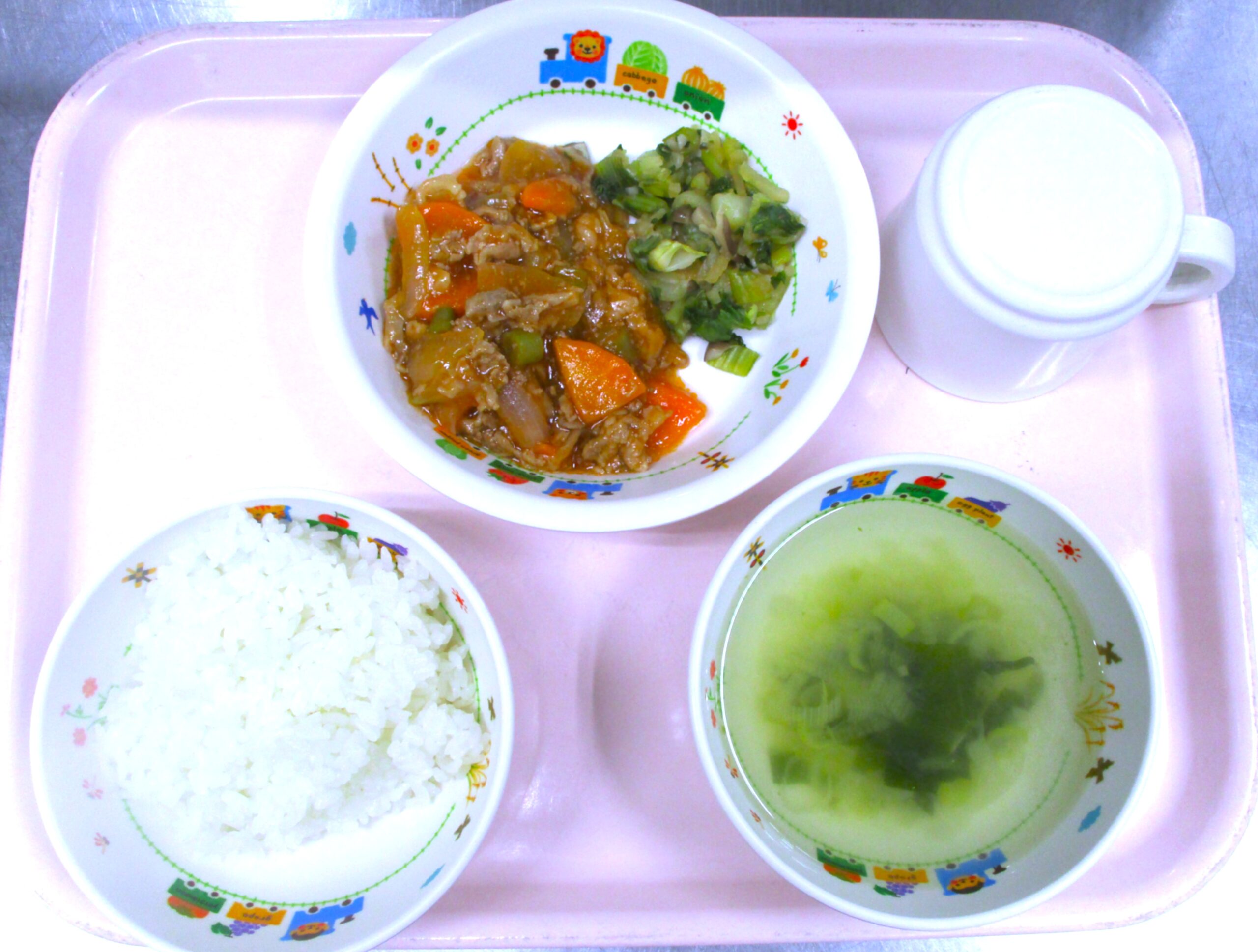 2025.08.21 🧅🥩酢豚🥕🫑 🏫大宮たんぽぽ保育園 🍽️今日の給食 🍚ごはん🍚 🍲中華スープ 酢豚 チンゲン菜🥬の和え物 いただきます。 -