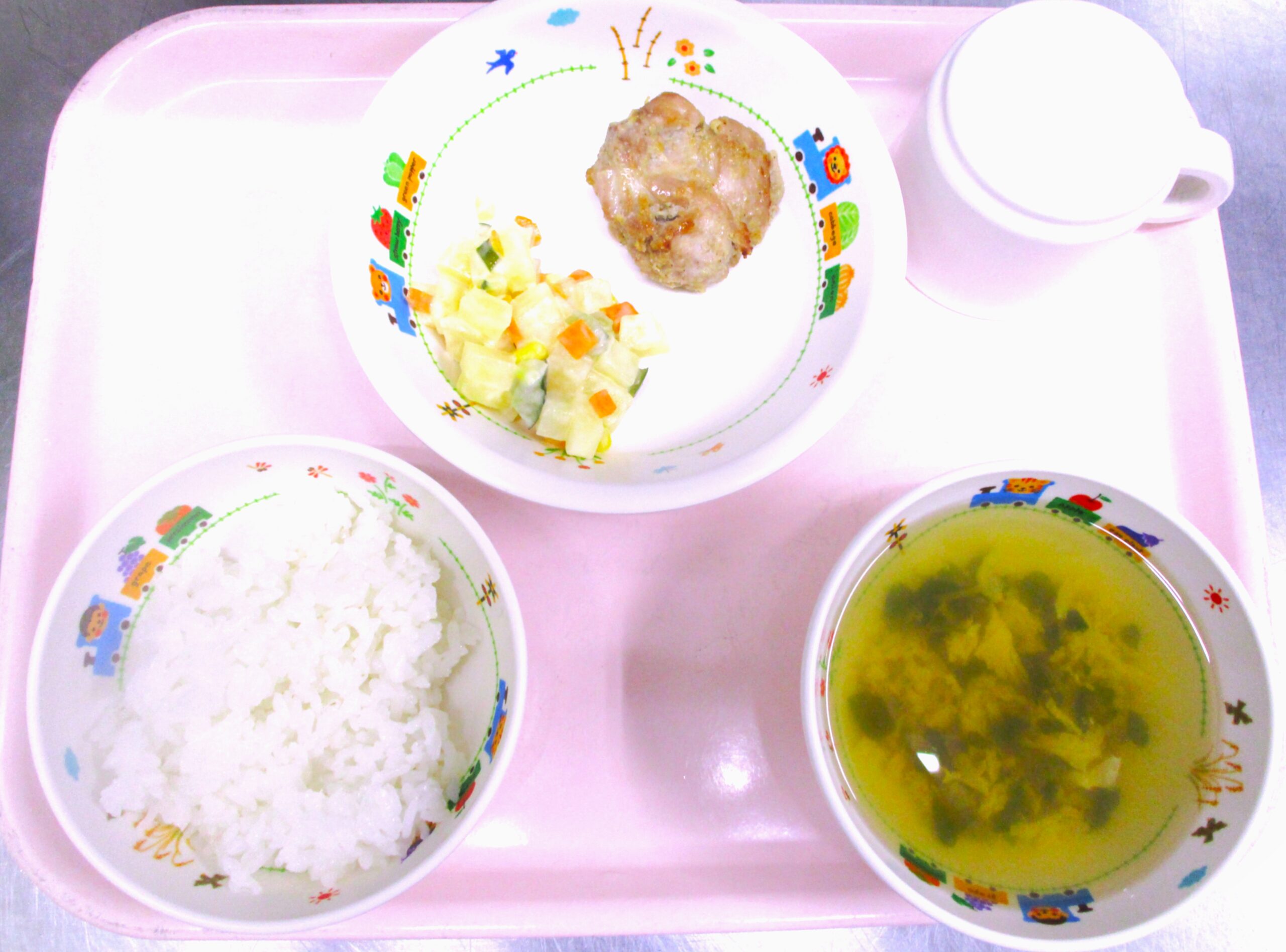 2025.08.22 鶏🍗肉のごまみそ漬け焼き 🌈大宮たんぽぽ保育園 🍽️今日の給食 🍚ごはん🍚 とうみょうのすまし汁 鶏肉🍗のごまみそ漬け焼き マセドアン🥗サラダ いただきます。 -