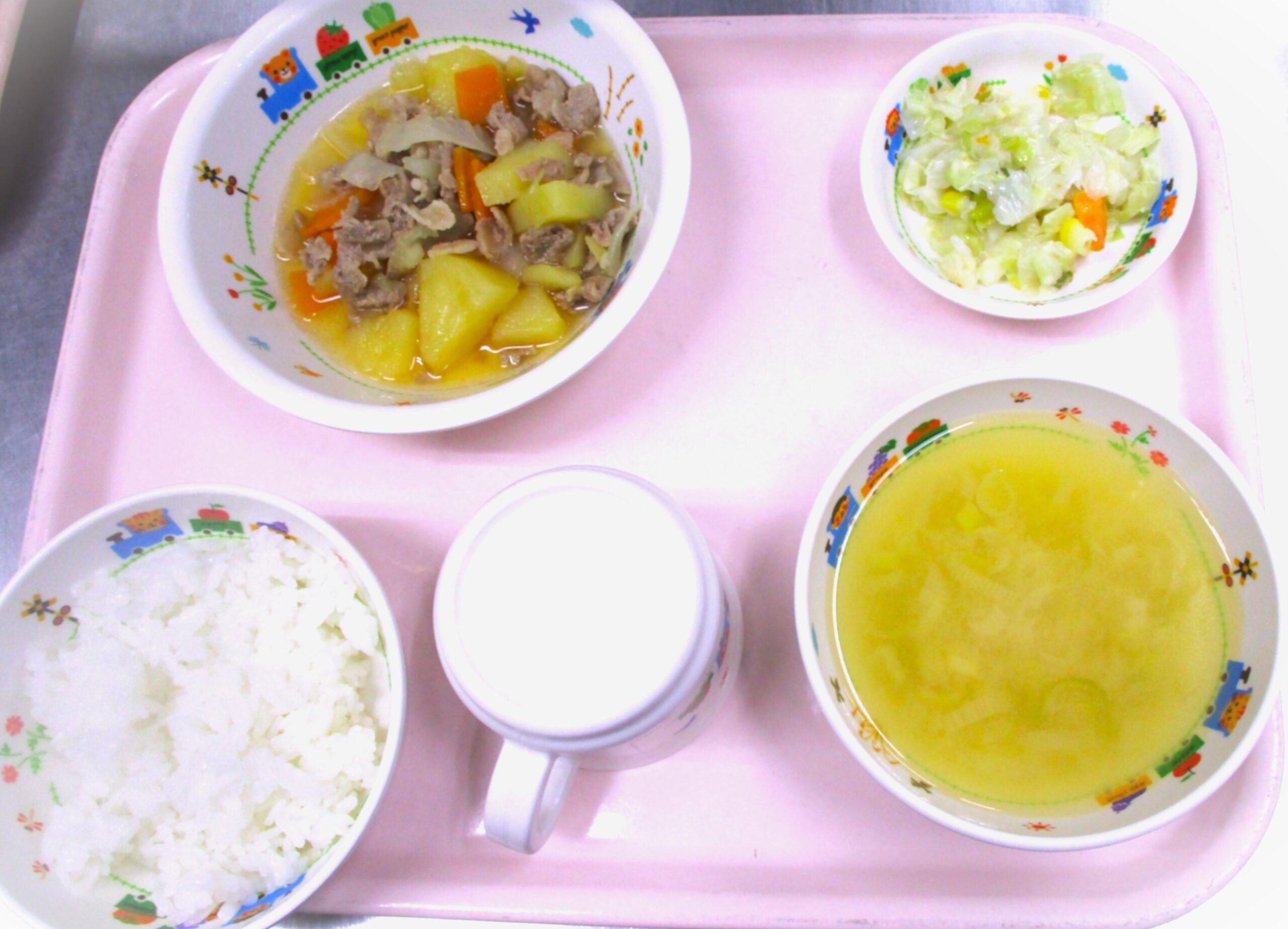 2025.08.25 豚肉と🥔じゃがいもの🥕煮物🧅 🏫大宮たんぽぽ保育園🌈 今日の給食🍽️ 🍚ごはん🍚 🍜油揚げのみそ汁 鶏肉と🥔じゃがいもの🥕煮物🧅 コールスロー🥗サラダ いただきます。 -