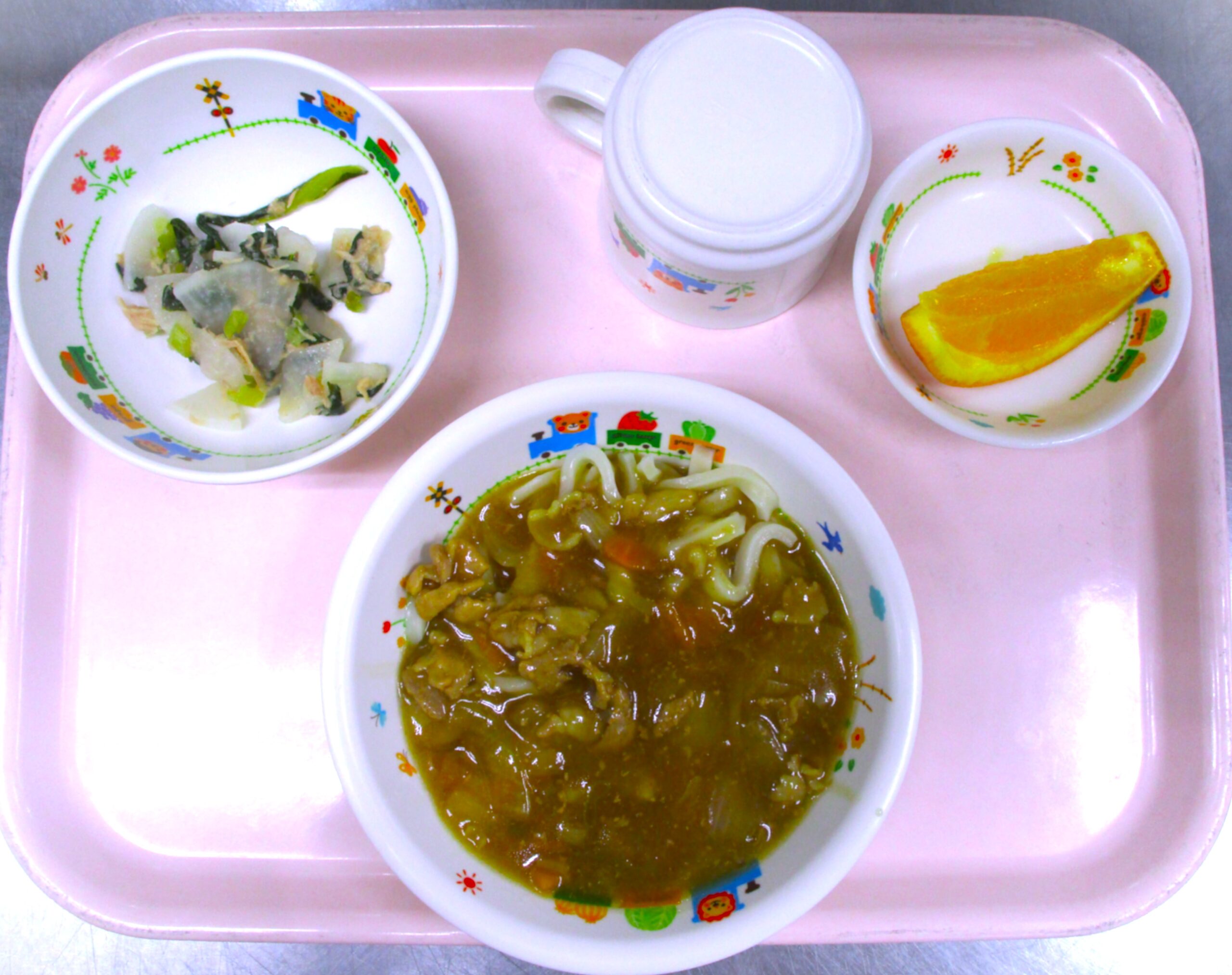2025.08.26 🍛カレーうどん🍴 🏫大宮たんぽぽ保育園 🌈今日の給食 🍛カレーうどん 大根とツナの🥗サラダ 🍊オレンジ🍊 いただきます。 -