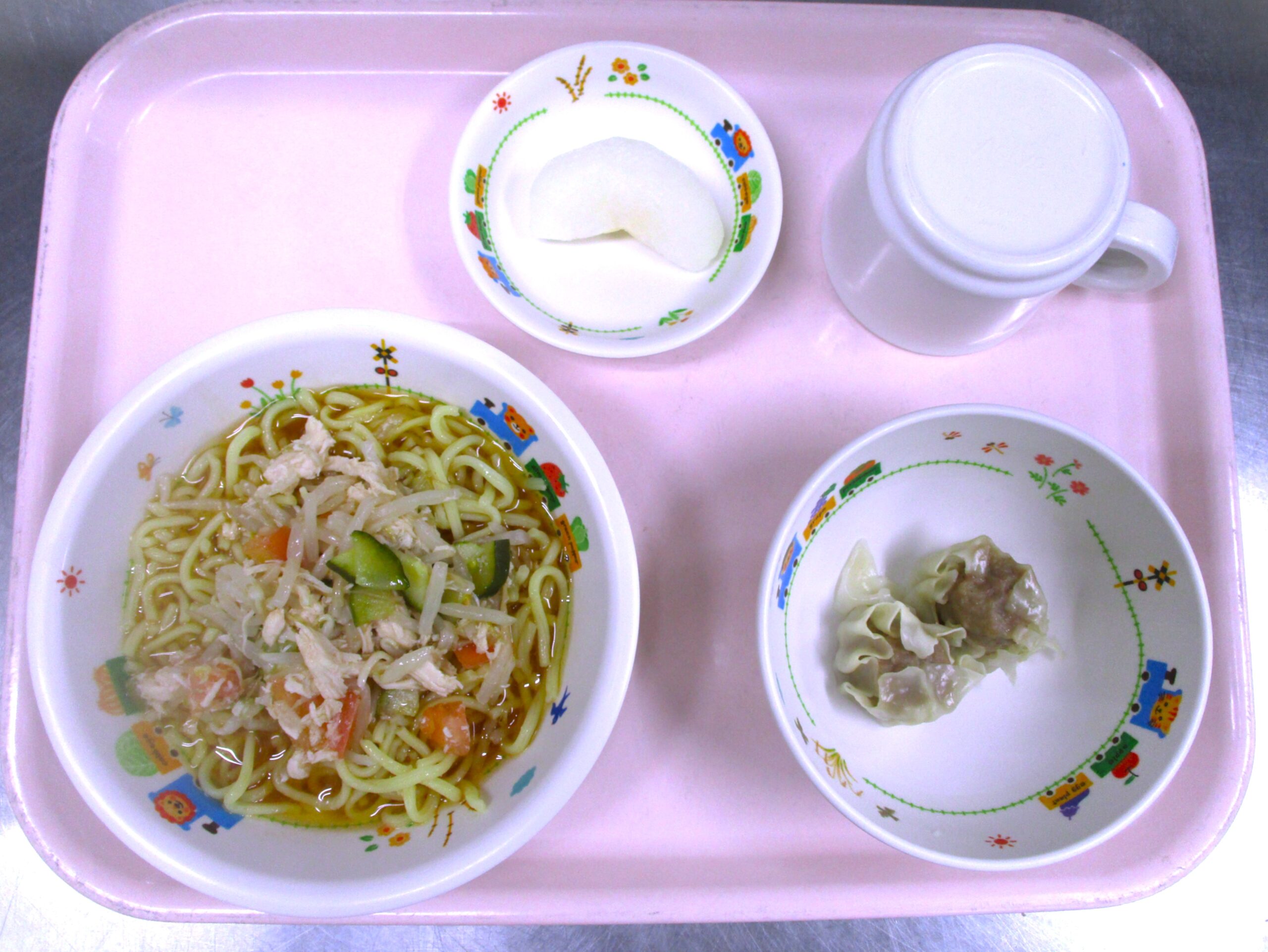 2025.08.06 🍜冷し中華🥒 🌈大宮たんぽぽ保育園 🍴今日の給食 🍜冷し中華 蒸しシュウマイ 梨 いただきます。 -