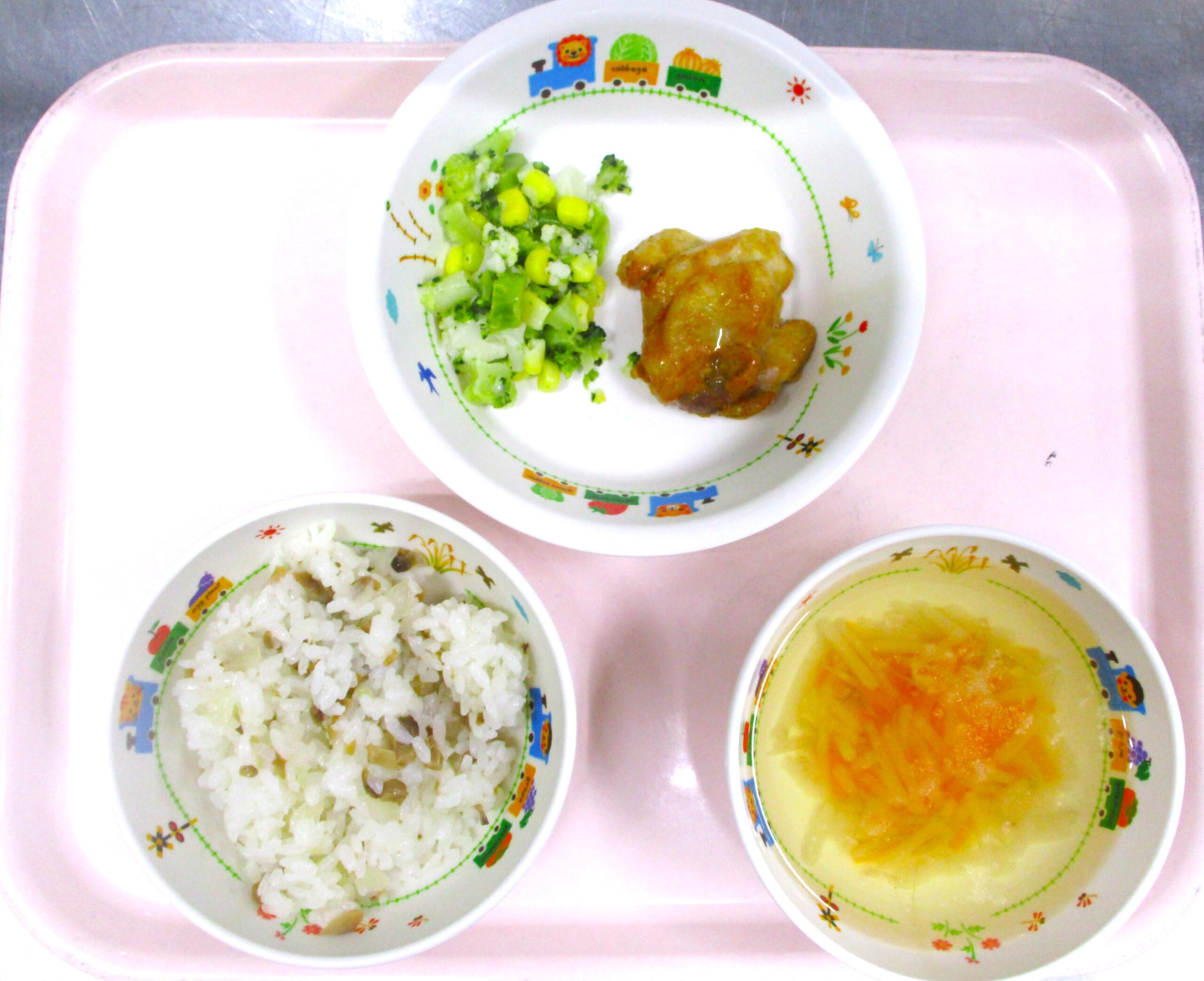 2025.07.11 タンドリー🍗チキン🍴 大宮たんぽぽ保育園🌈 今日の給食🍽️ 🍚ピラフ🥕🧅 コンソメスープ🍲 タンドリー🍗チキン フレンチ🥗サラダ いただきます。