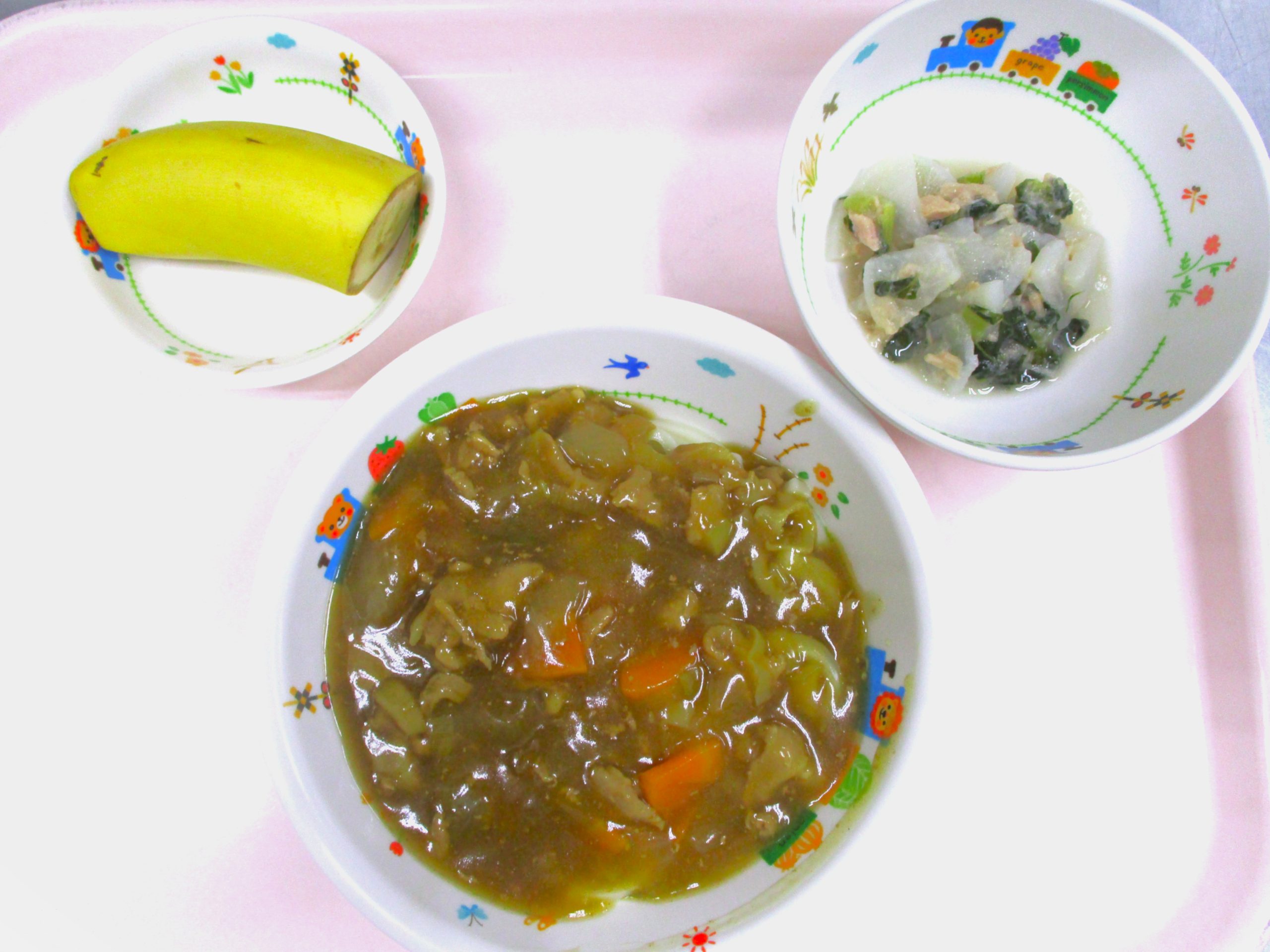 2025.05.30 🍛カレーうどん🍜 大宮たんぽぽ保育園🌈 今日の給食🍽️ 🍛カレーうどん 大根とツナの🥗サラダ 🍌バナナ🍌 いただきます。 -
