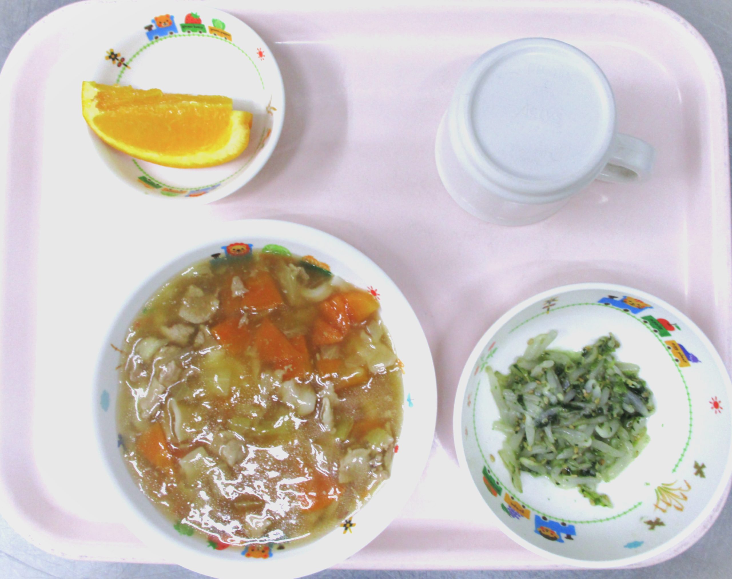 2025.04.18 あんかけうどん 🏫大宮たんぽぽ保育園 🌈今日の給食 🍜あんかけうどん 🥬もやしの塩ナムル 🍊オレンジ いただきます。 -