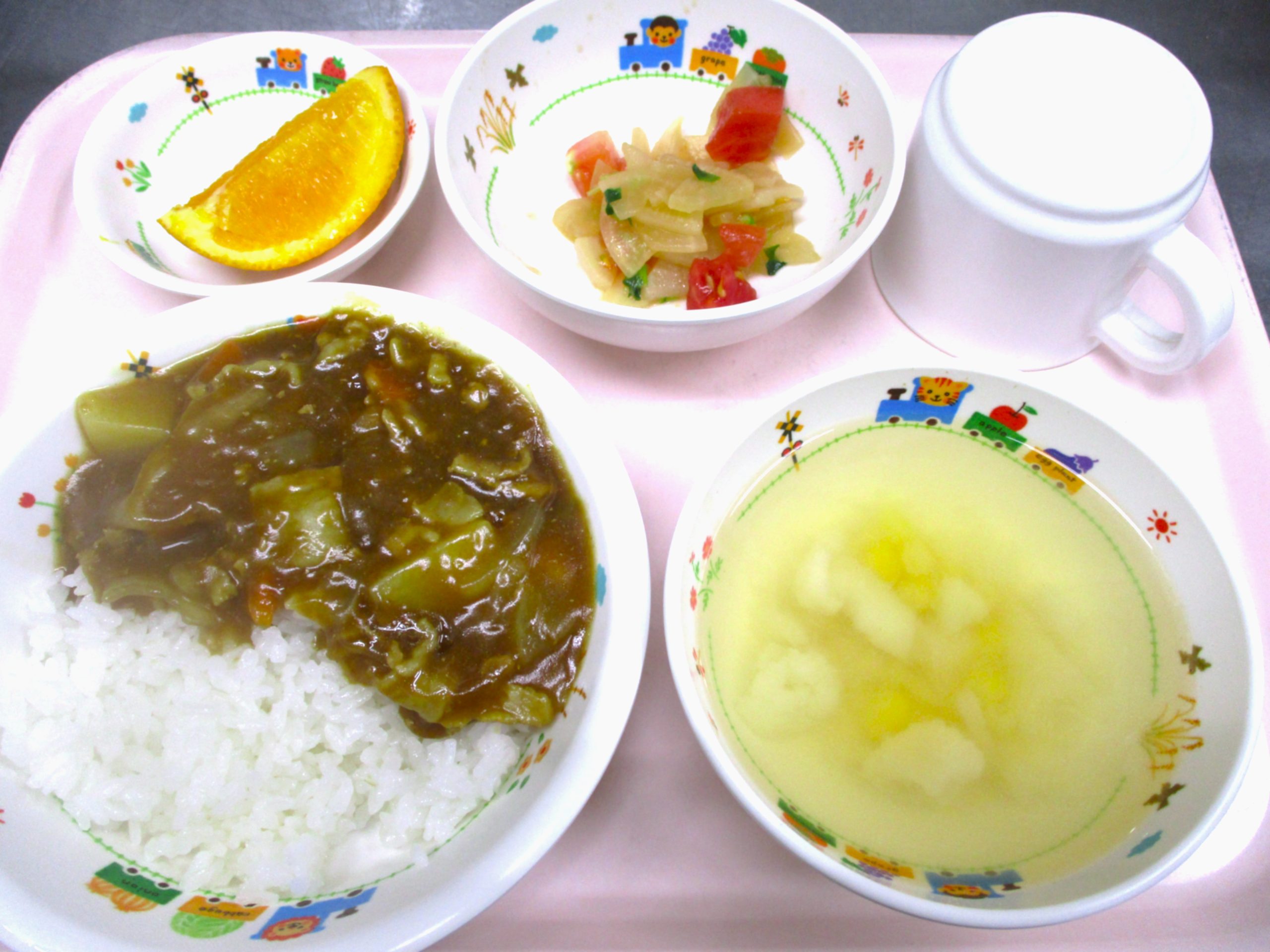 2025.04.24 ポーク🍛カレー 大宮たんぽぽ保育園🌈 今日の給食🍽️ ポーク🍛カレー カリフラワー🥦のスープ 大根🥗サラダ 🍊オレンジ いただきます。 -