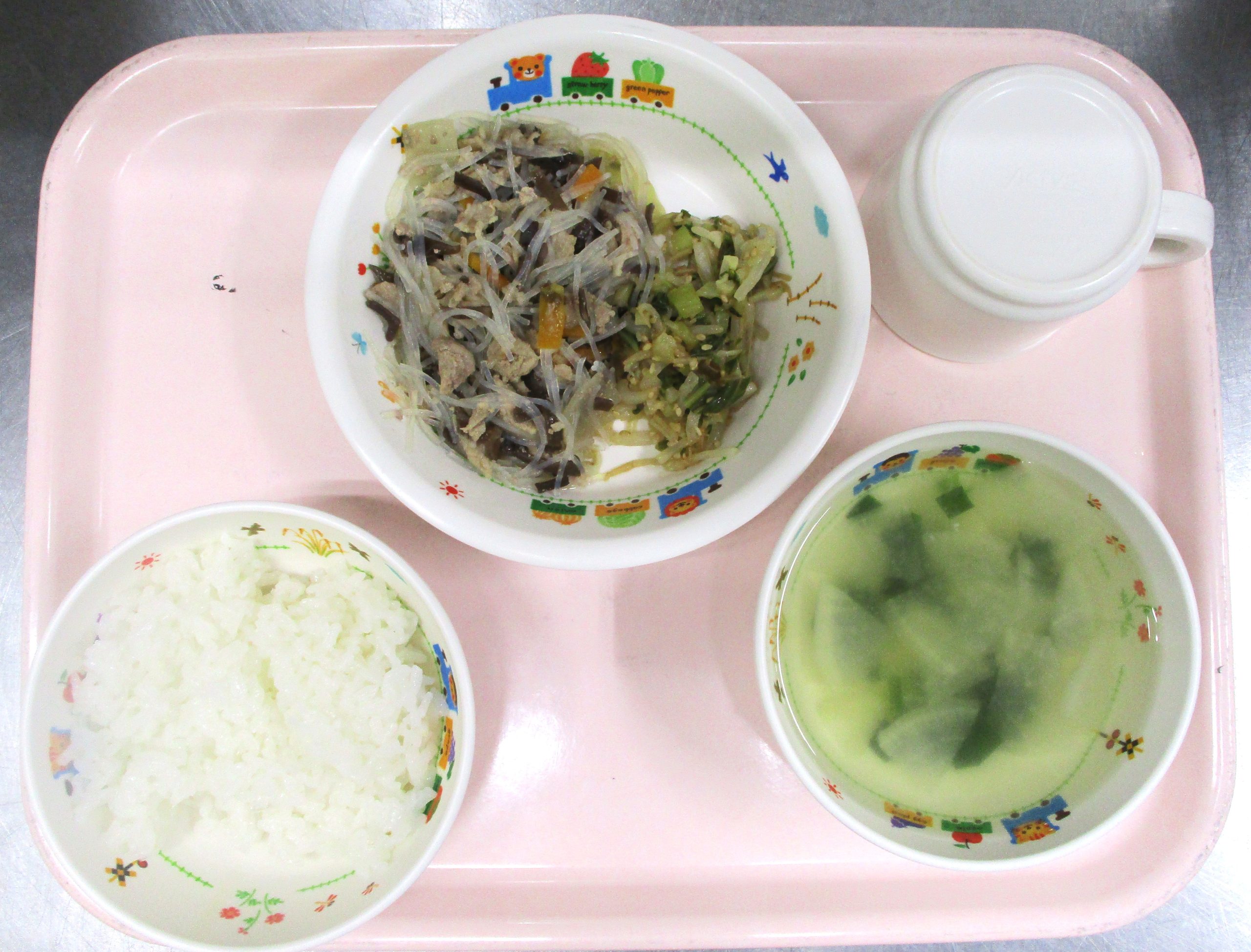 2025.04.02 豚肉と春雨の炒め物 大宮たんぽぽ保育園 今日の給食 🍚ごはん 大根のスープ 豚肉と春雨の炒め物 チンゲン菜のナムル いただきます