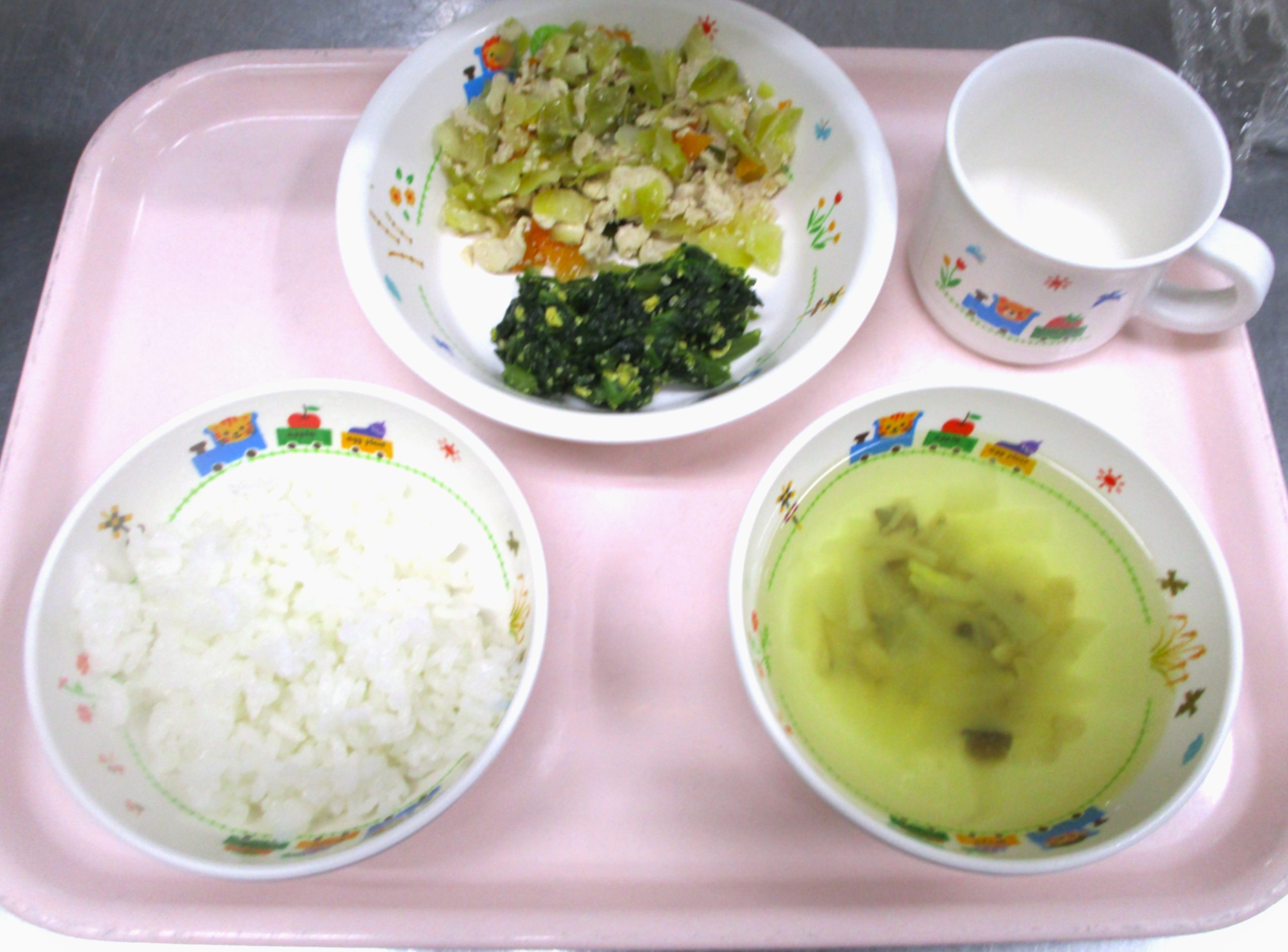 2025.03.26 鶏肉🍗と🥬キャベツのみそ炒め🍴 さいたま市北区🏫 大宮たんぽぽ保育園🌈 今日の給食🍽️ 🍚ごはん しめじのスープ🍲 鶏肉🍗と🥬キャベツのみそ炒め🍴 ほうれん草🥬のナムル🥕 いただきます。😊 -