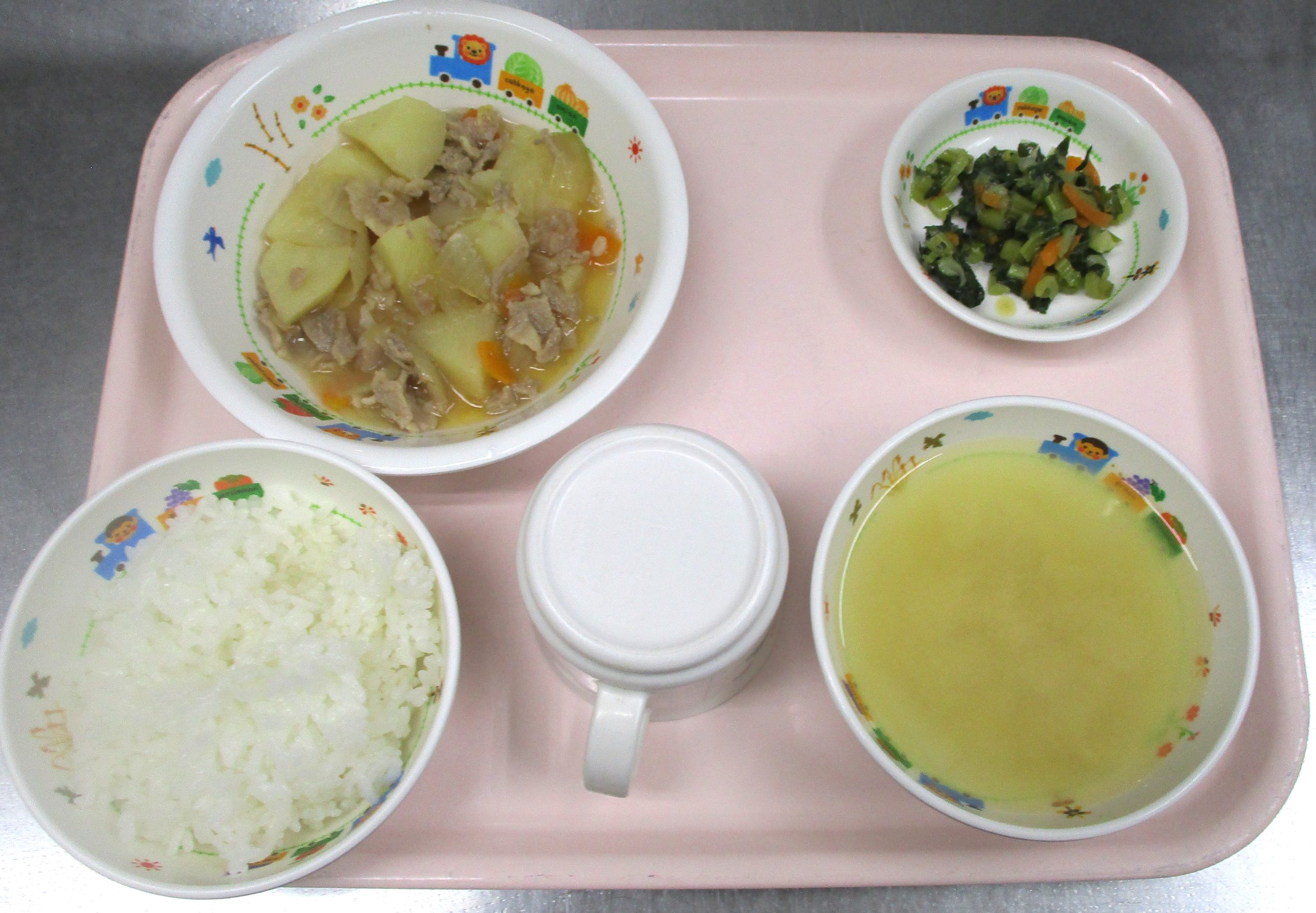 2025.03.28 肉じゃが🧅🥕 さいたま市 北区 大宮たんぽぽ保育園🌈 今日の 給食🍽️ 🍚ごはん 大根のみそ汁🍜 肉じゃが 🥗小松菜のサラダ いただきます。 -