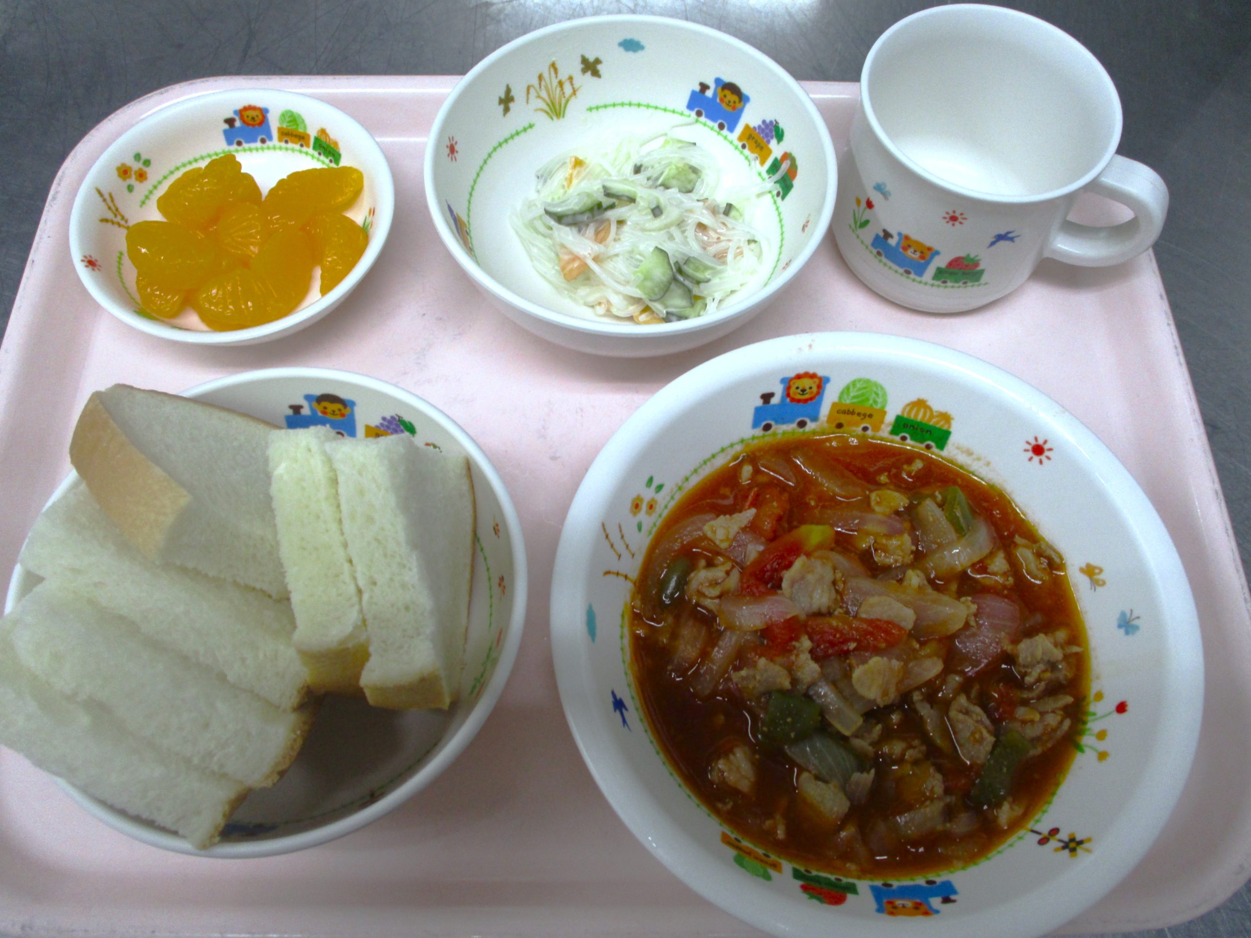 2025.03.18 🍽️豚肉のトマト煮🍅 大宮たんぽぽ保育園🌈 今日の給食🍽️ 🍞パン🍞 🍅豚肉のトマト煮 🥗シルバーサラダ 🍊みかん缶 いただきます。 -