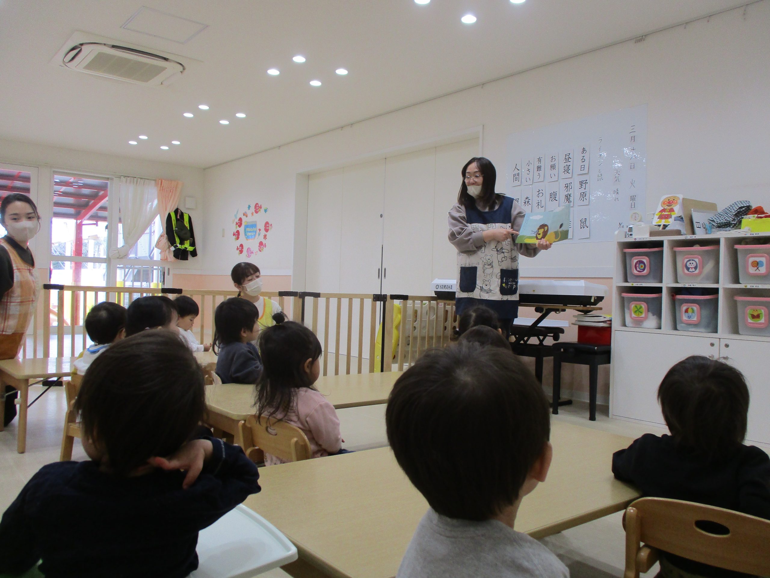 2025.03.18 1歳児あんず組 言葉の学習 1歳児あんず組は毎朝言葉の学習として絵本を読み、その中に出てくる漢字を皆で声に出して読みます。みんな漢字に興味があり今日もとても元気な声です♪ -