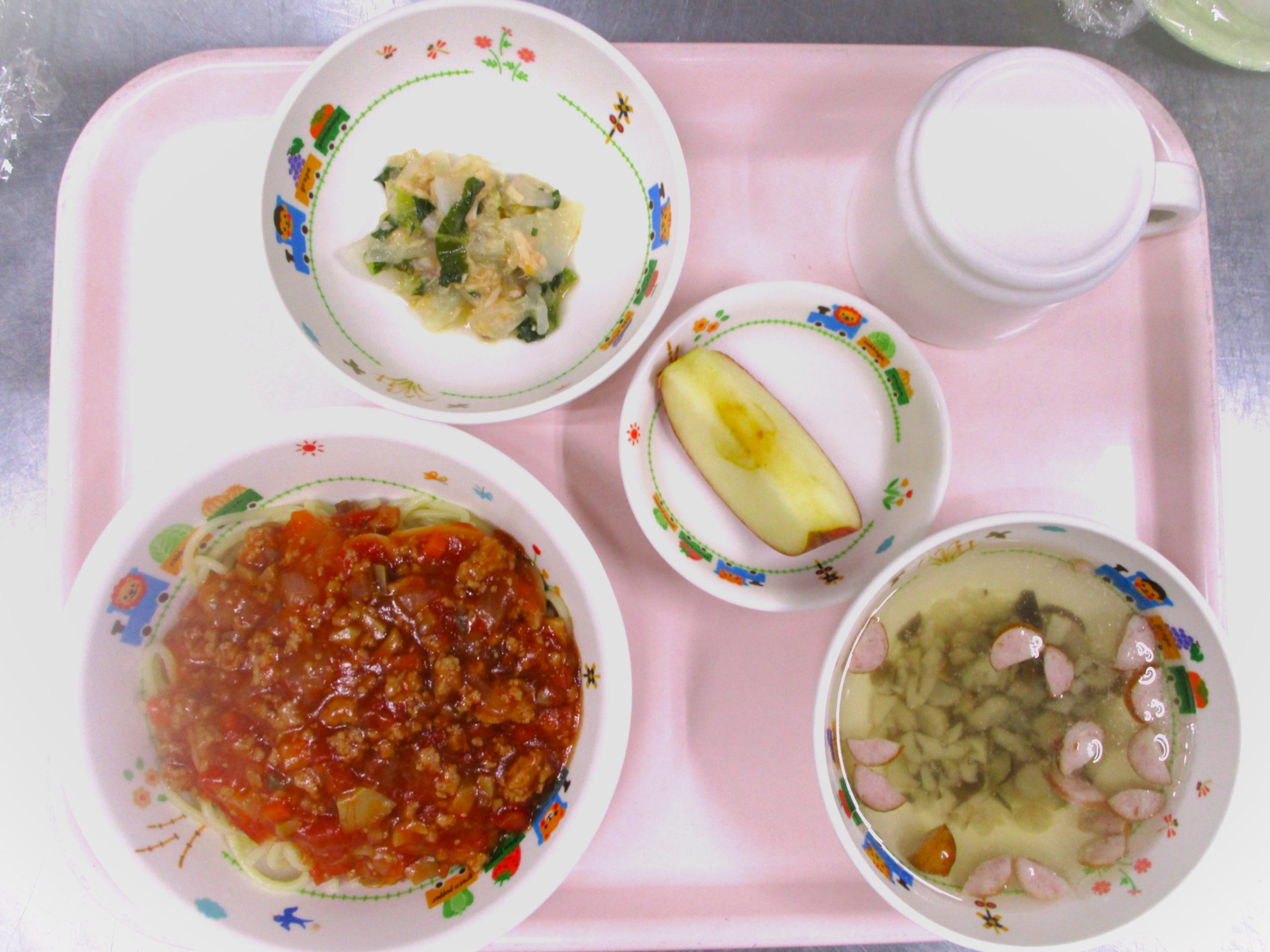 2025.01.23 ミートソーススパゲッティ🍝 大宮たんぽぽ保育園🌈 今日の給食🍽️ ミートソーススパゲッティ🍝 しめじのスープ🍄🟫 大根とツナのサラダ🥗 リンゴ🍎 いただきます。