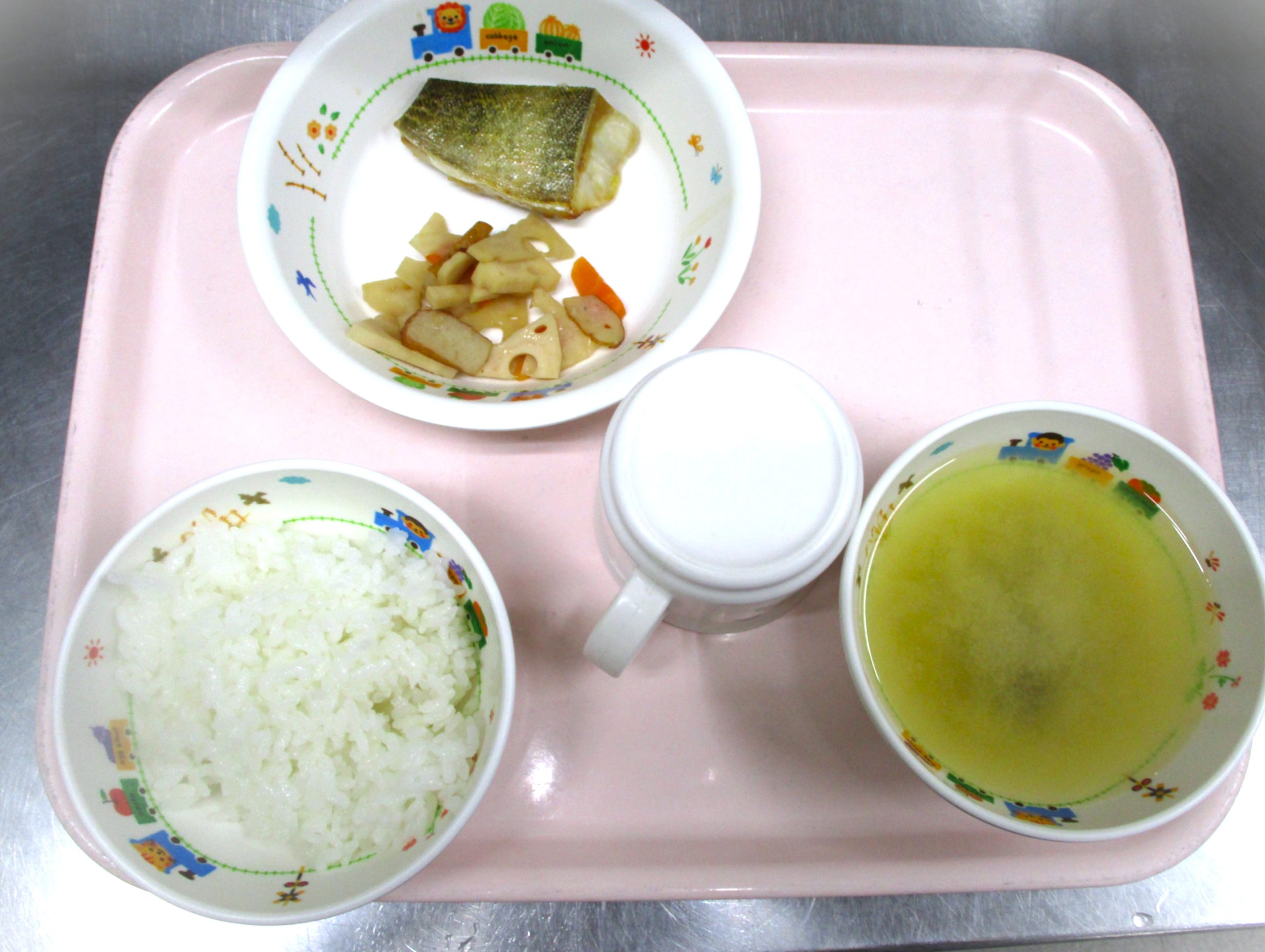 2025.01.27 ほっけのみりん焼き🐟 大宮たんぽぽ保育園 今日の 給食 🍚ごはん 長ネギのみそ汁🍜 ほっけのみりん焼き🐟 れんこんの金平🥕 いただきます。 -