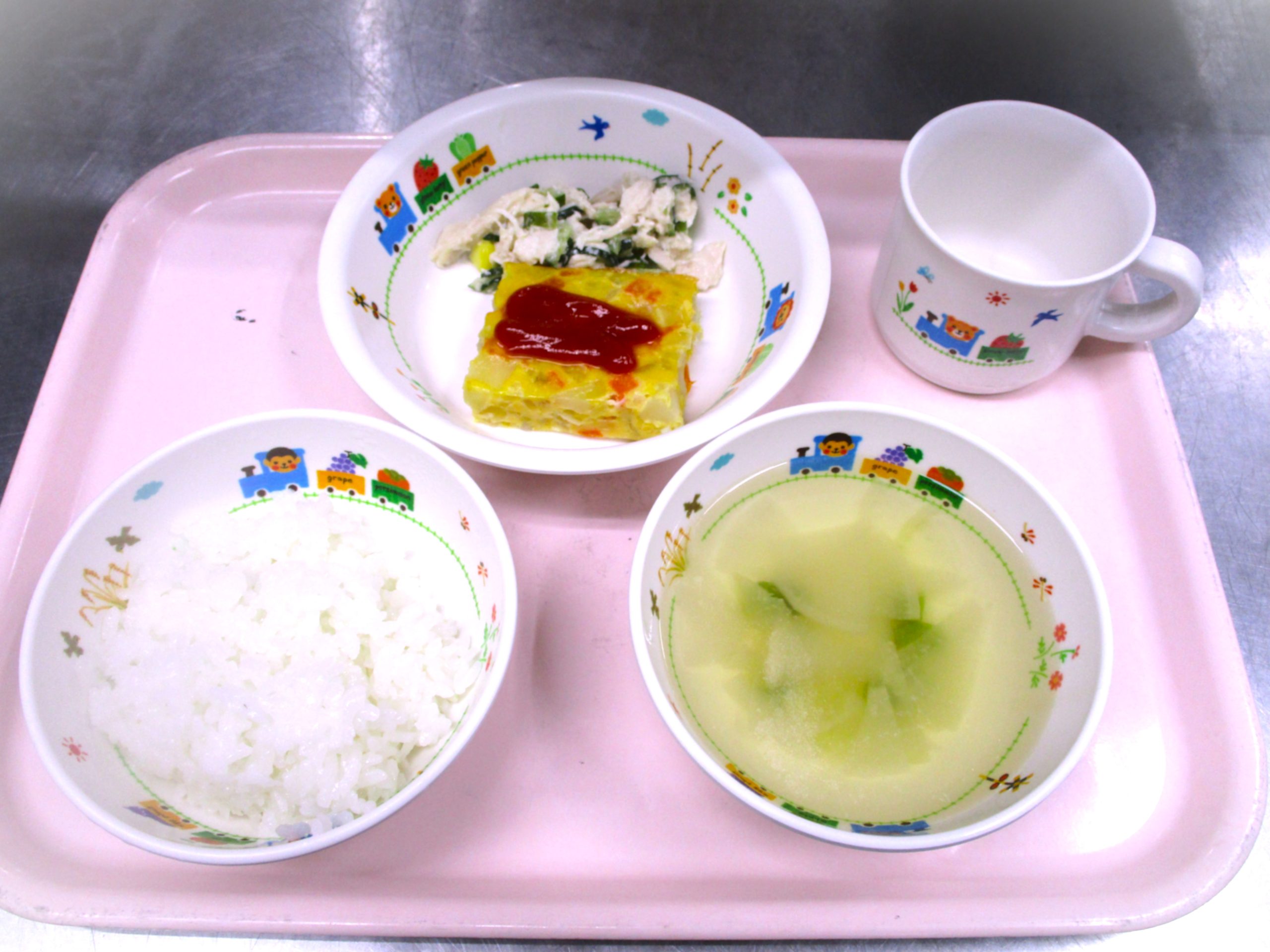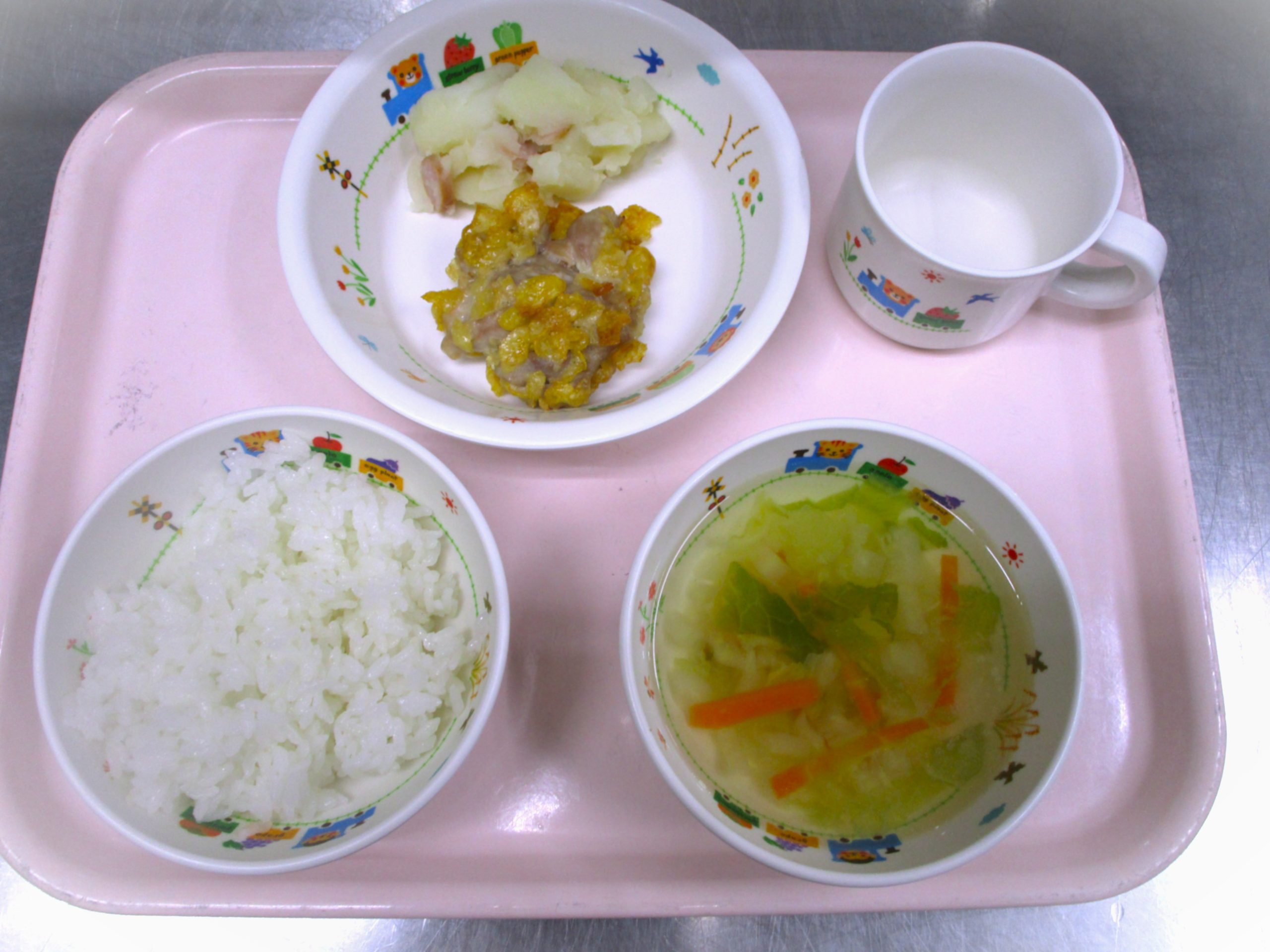 2025.01.30 鶏肉の🌽コーンフレーク焼き 大宮たんぽぽ保育園🌈 今日の給食 🍚ごはん 白菜のスープ 鶏肉の🌽コーンフレーク焼き ジャーマンポテト いただきます。 -