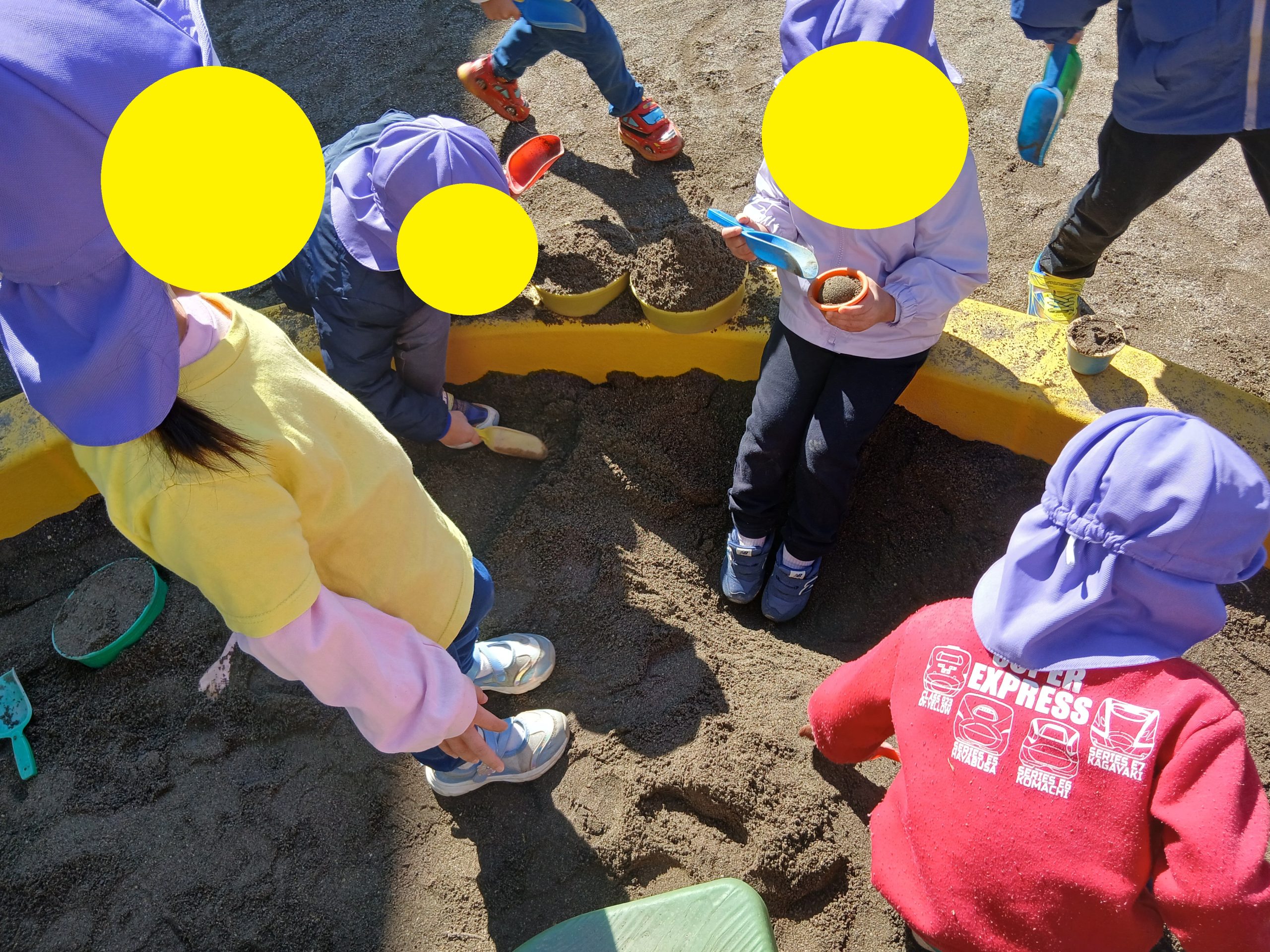 2026.03.11 3歳児 砂場で温泉作り♨🎶 砂場で遊ぶもも組さん🍑大きな穴を掘って遊んでいました😄何を作っているの?と子どもたちに聞くと「落とし穴だよ!」と教えてくれました✨なんだか温泉や足湯にも見えるねと話すと「じゃあさみんなが入れるぐらいの♨作るね!」「工事中だから入らないでください!」と張り切っていました💪みんなで深い穴を作ると「じゃ -