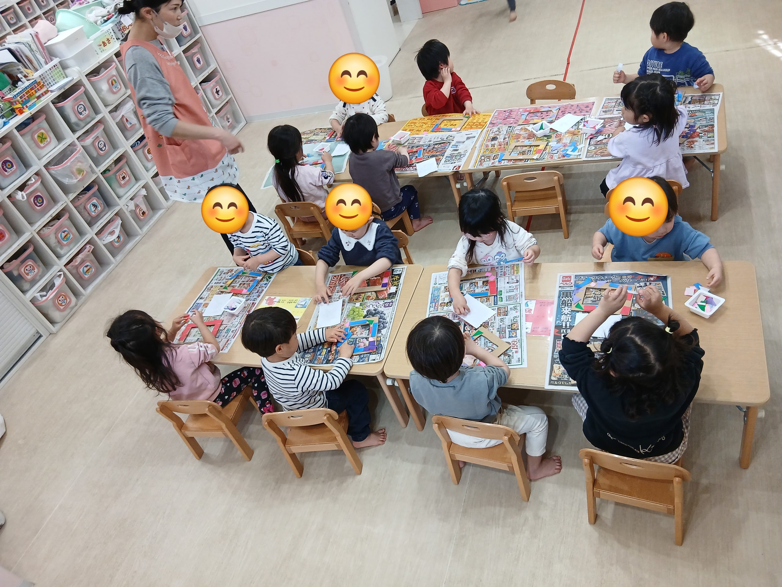 2026.03.17 2歳児 ✨オリジナルフレーム作り✨ いちご組では、昨日から… 1日目…好きな色の画用紙に自由画と自分の顔をクレヨンで製作🖍 2日目…段ボールの額縁に色々な色・形の折り紙やシールを貼ってオリジナルフレーム作り 3日目…2日間で作ったものをくっつけて完成✨ と3日間で作品作りをしています😊 今日は2日目のフ -