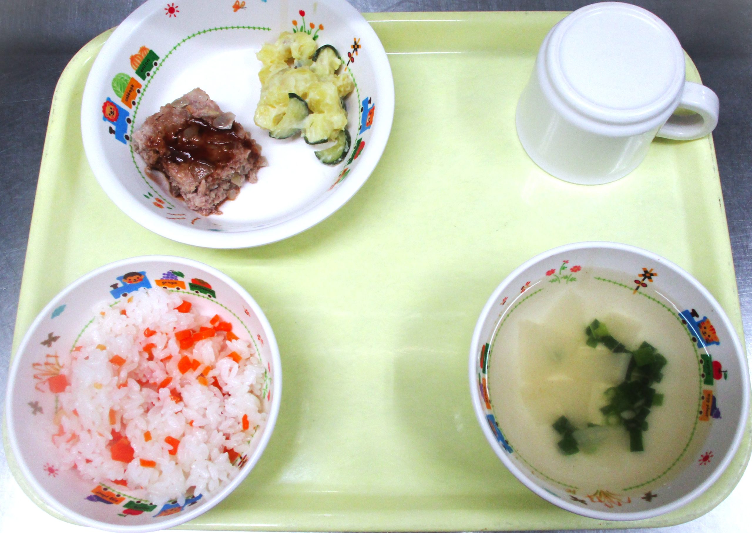 2026.03.16 🥕キャロットライス🍚 🌈大宮たんぽぽ保育園 🍽️今日の給食 🥕キャロットライス 大根のスープ ハンバーグ サツマイモの🥗サラダ いただきます。 -