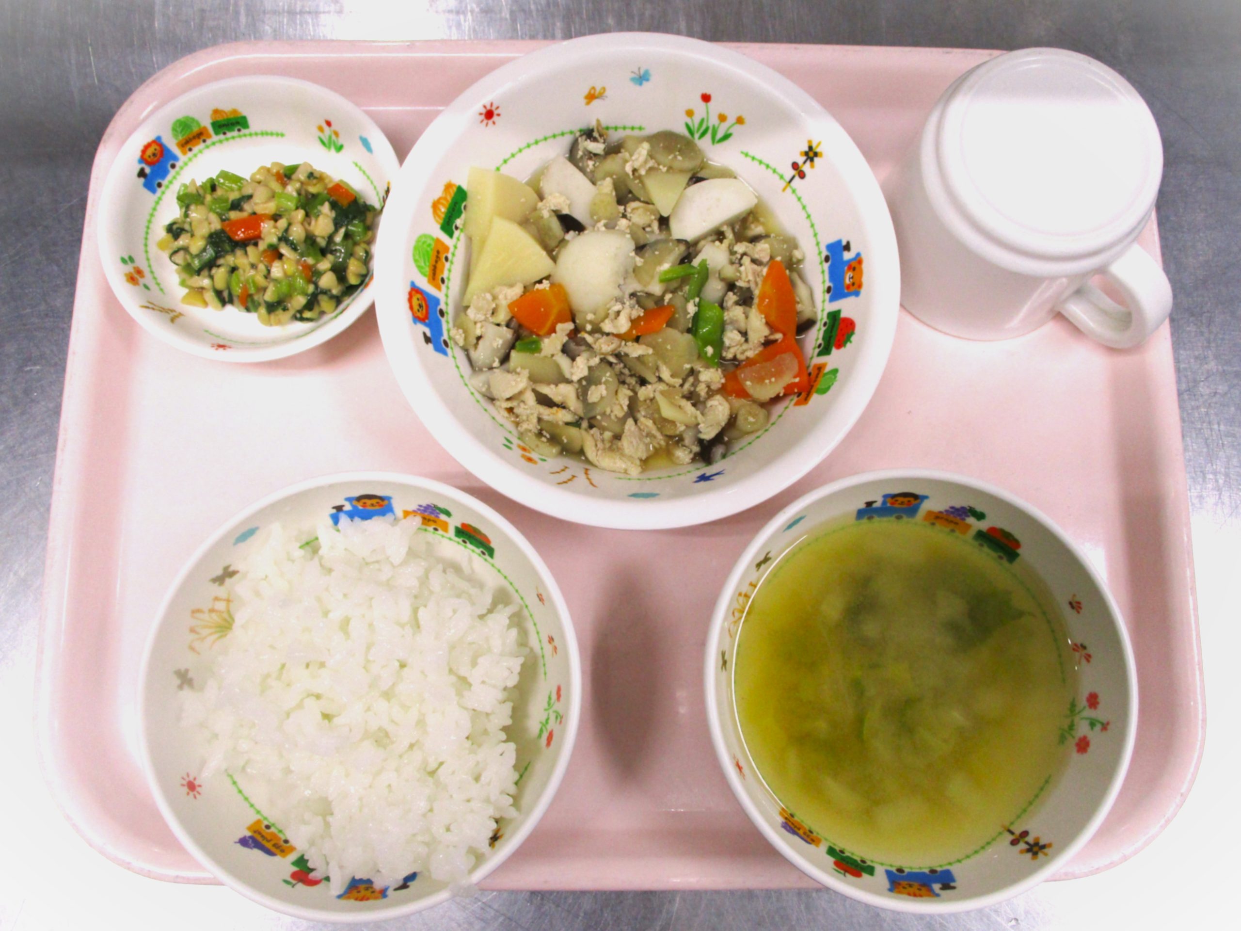 2024.10.30 🍠筑前煮🧅🥕🥔 🌰大宮たんぽぽ保育園🌈 今日の給食🍽️ 🍚ごはん 🥬白菜のみそ汁🍜 🍠筑前煮🥕🧅🥔 青菜の納豆和え🥬 いただきます。