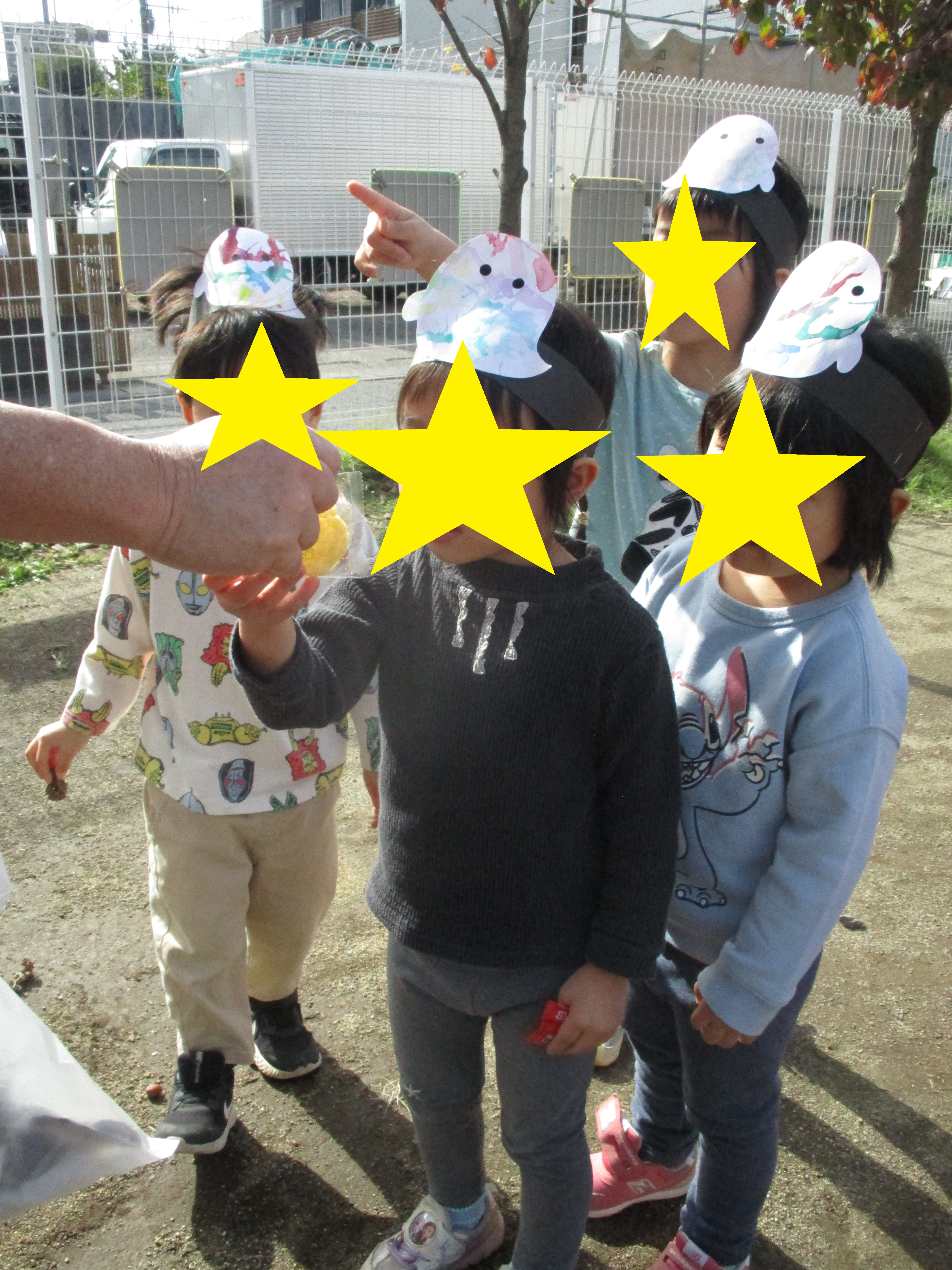 2024.10.31 トリックオアトリート! 大宮たんぽぽ保育園 今日は子どもたちが待ちに待ったハロウィン🎃 もも組さんでは自分で作ったおばけのお面を付け、みんなでウキウキしながらお菓子をもらいに行きました! おかしをもらうためのヒントは、「カボチャが3つ」と「コウモリ」でした! ヒントを見つけると嬉しそうに駆け寄り、 -