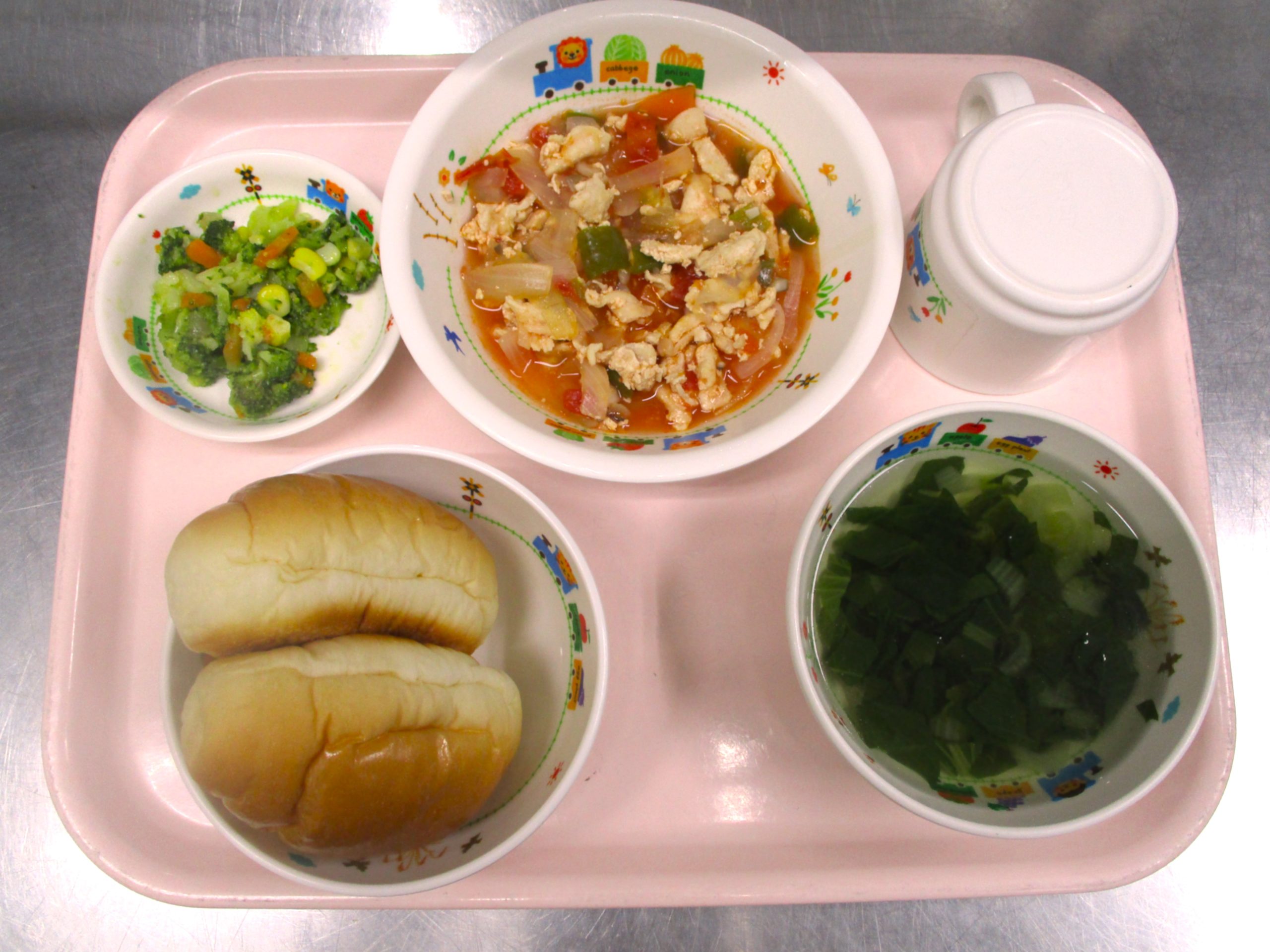 2024.11.06 🍗鶏肉のトマト煮 大宮たんぽぽ保育園🌈 今日の給食 🥖ロールパン 🍲小松菜のスープ 🍗鶏肉のトマト煮 🥗彩りサラダ 🥖ジャムサンド いただきます。 -