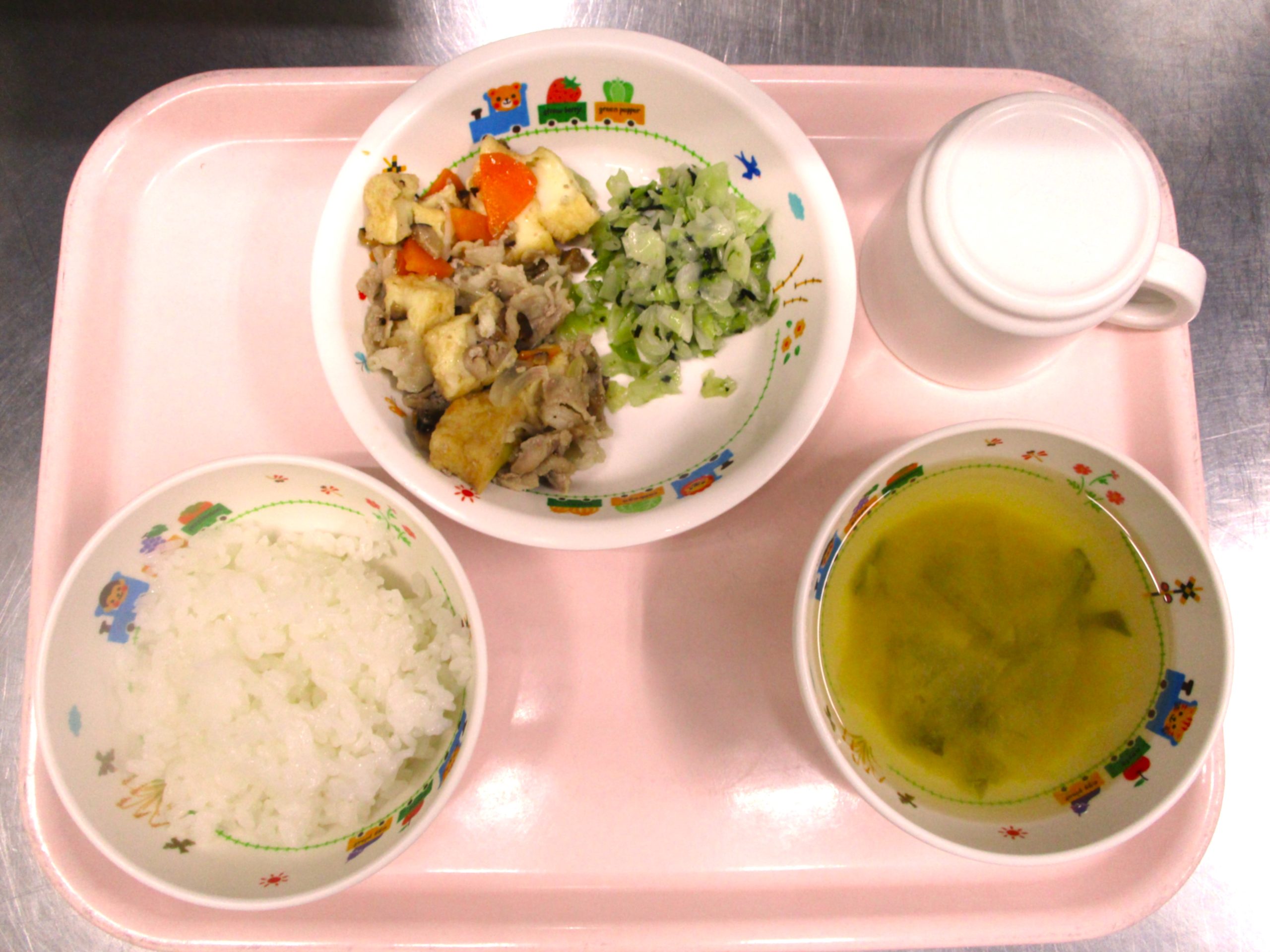 2024.10.23 生揚げの中華風炒め 大宮たんぽぽ保育園 今日の給食🍽️ 🍚ごはん 🍜大根のみそ汁 🧇🍴生揚げの中華風炒め キャベツとのりのナムル いただきます