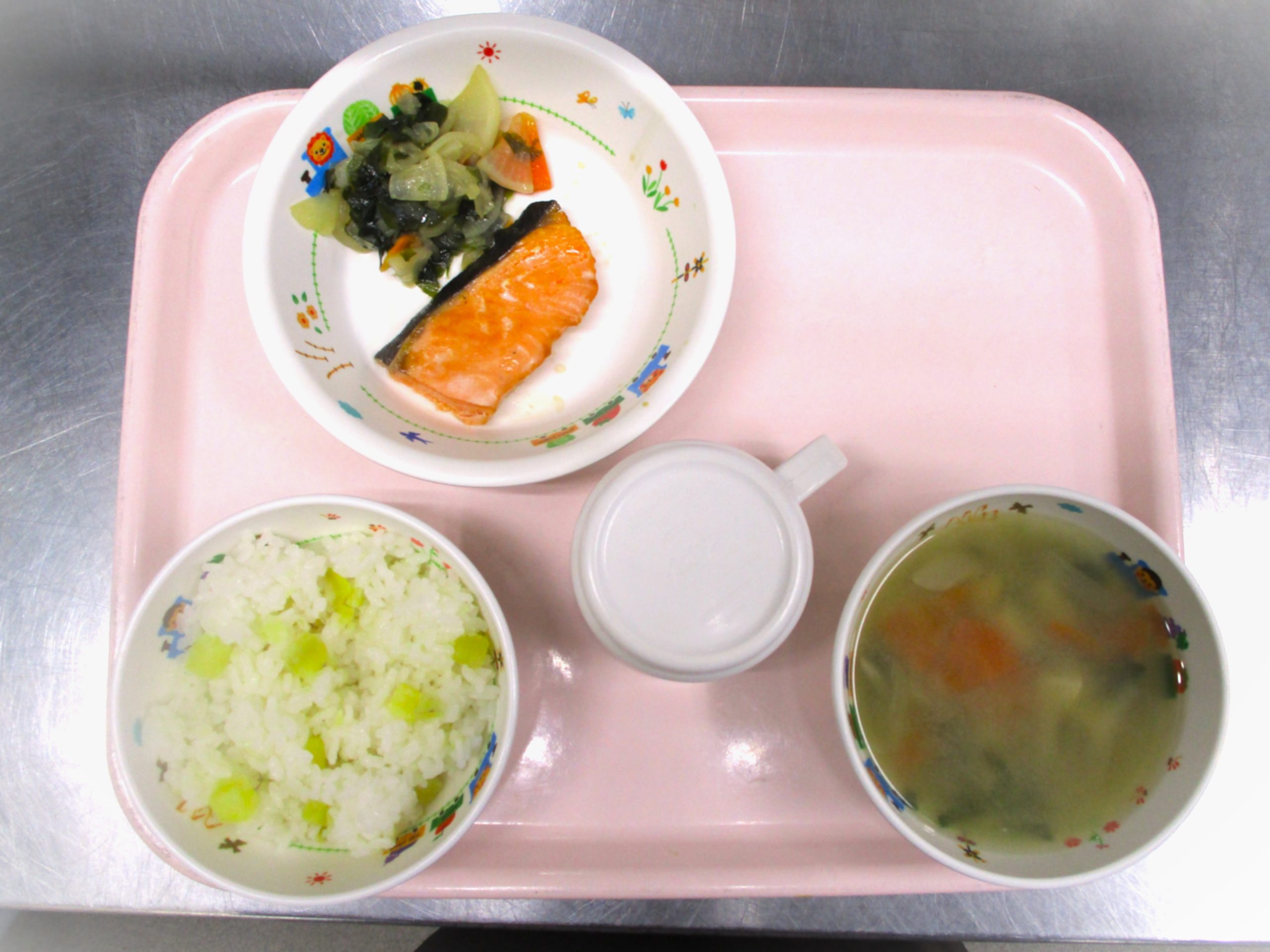 2024.10.15 🍠さつまいもごはん 大宮たんぽぽ保育園🌈 今日の給食🍽️ 🍠さつまいもごはん 🍜具だくさんみそ汁 🐟さけの照り焼き 🥗大根の和え物 いただきます