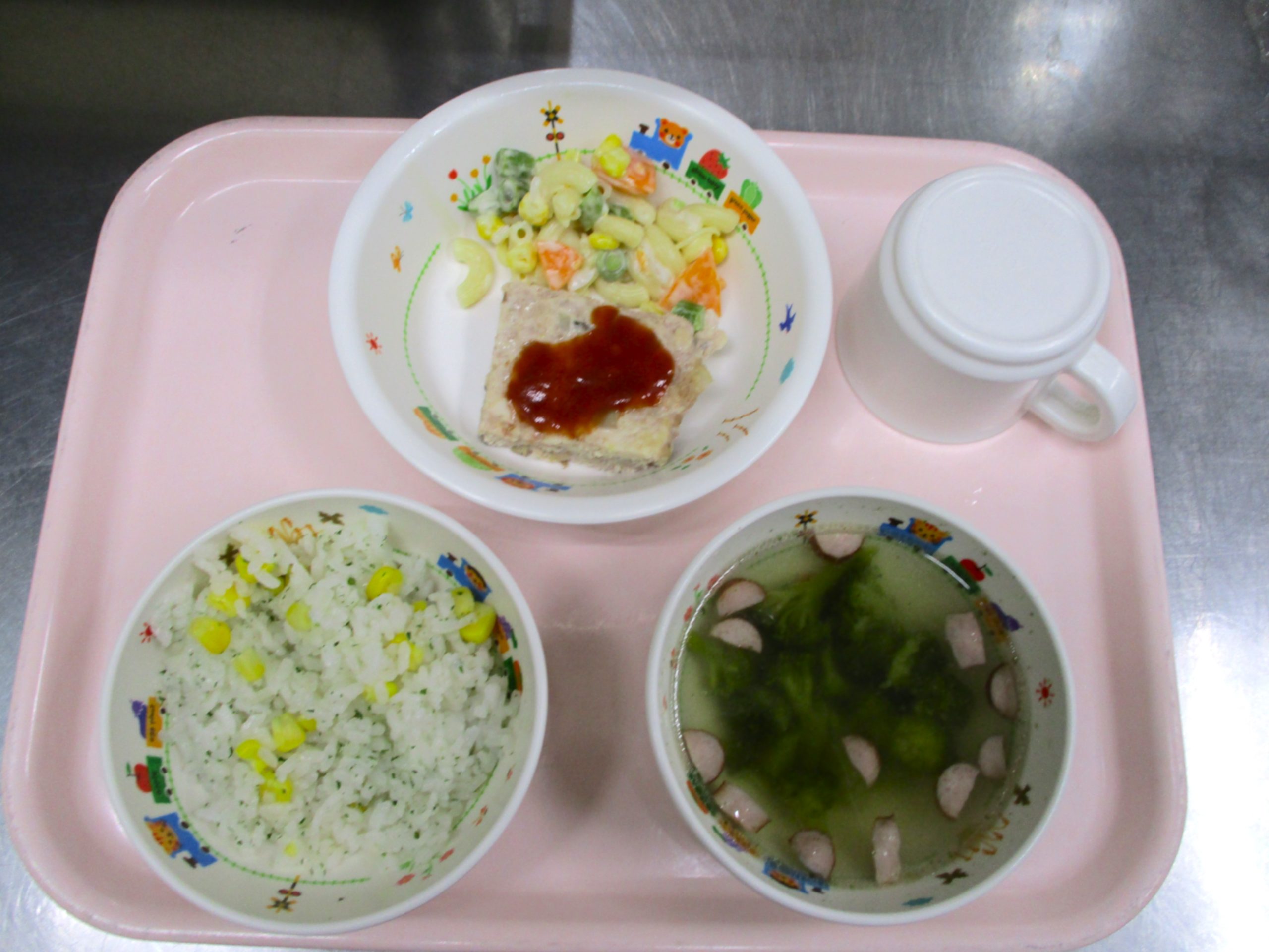2024.08.19 コーンライス🌽 大宮たんぽぽ保育園🌈 今日の給食 🌽コーンライス🍜コンソメスープ🍲ハンバーグ🍽️ マカロニサラダ🥗 いただきます。 -