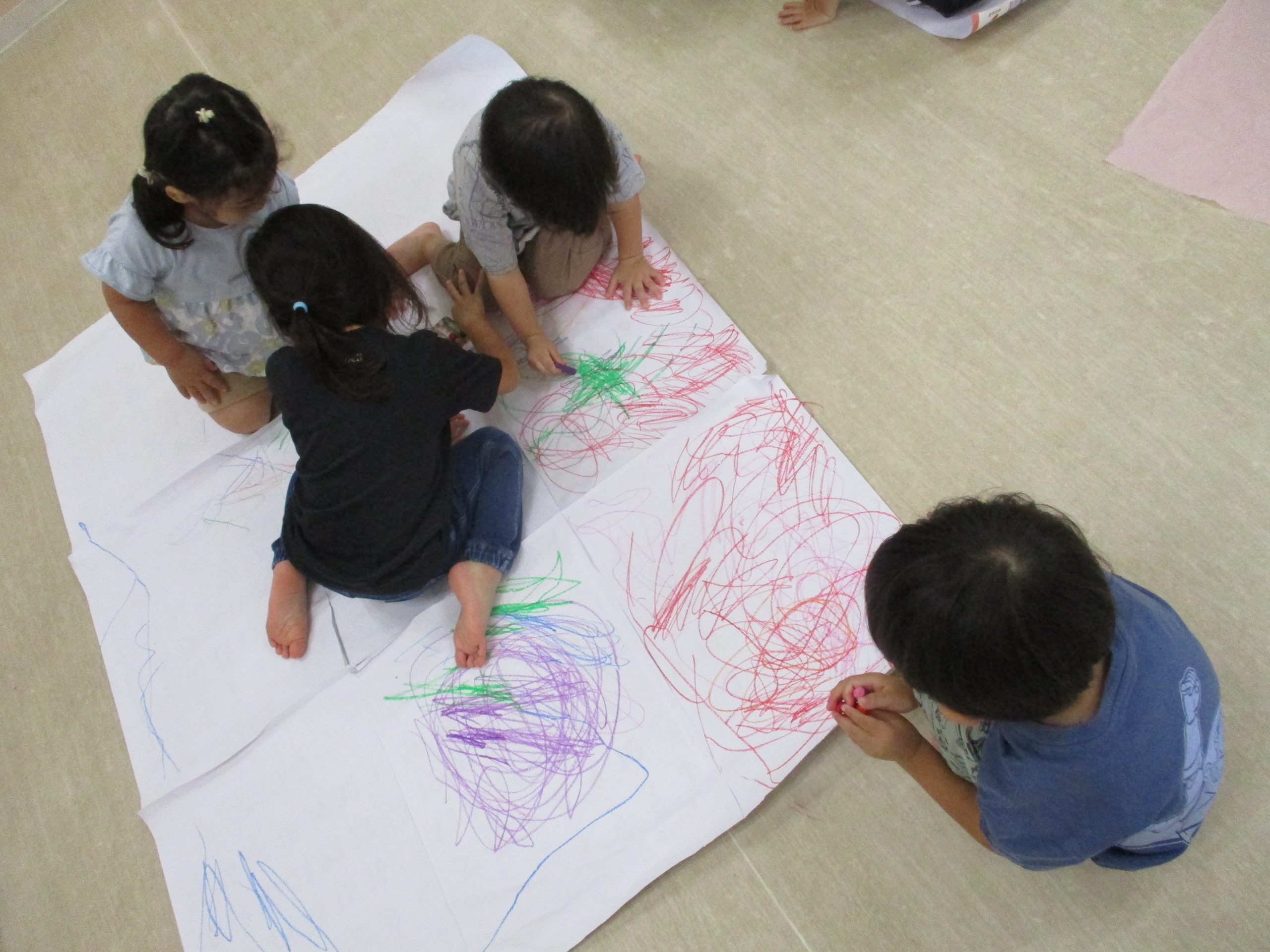 2024.08.09 大きな紙にいっぱいお絵描き🖍️✨ いちご組さんのとある日の出来事…💭 カレンダーの裏紙を繋げ、大きな紙に変身!!! 子どもたちは、大きな紙がお部屋に広げられると何をするのかワクワクしている様子🤗 3つのグループに分かれて大きな紙にクレヨンでお絵描きをしました😁 赤のクレヨンを使って新幹線を描いたり、紫のクレ