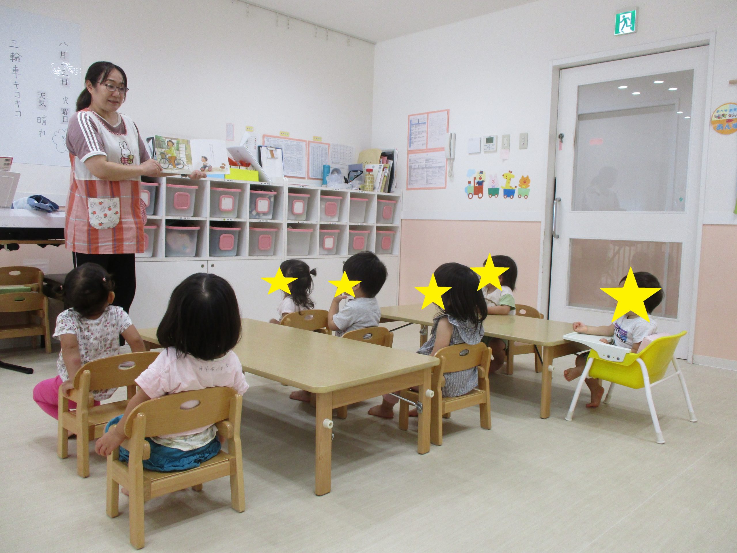 2024.08.13 あんず組 漢字の勉強 1歳児あんず組も朝の会、朝のおやつが終わると漢字の勉強をします。 今月は「三輪車 キコキコ」です。 先生が絵本にでてくる漢字を言った後に子どもたちも続いて大きな声で言っています♪ -