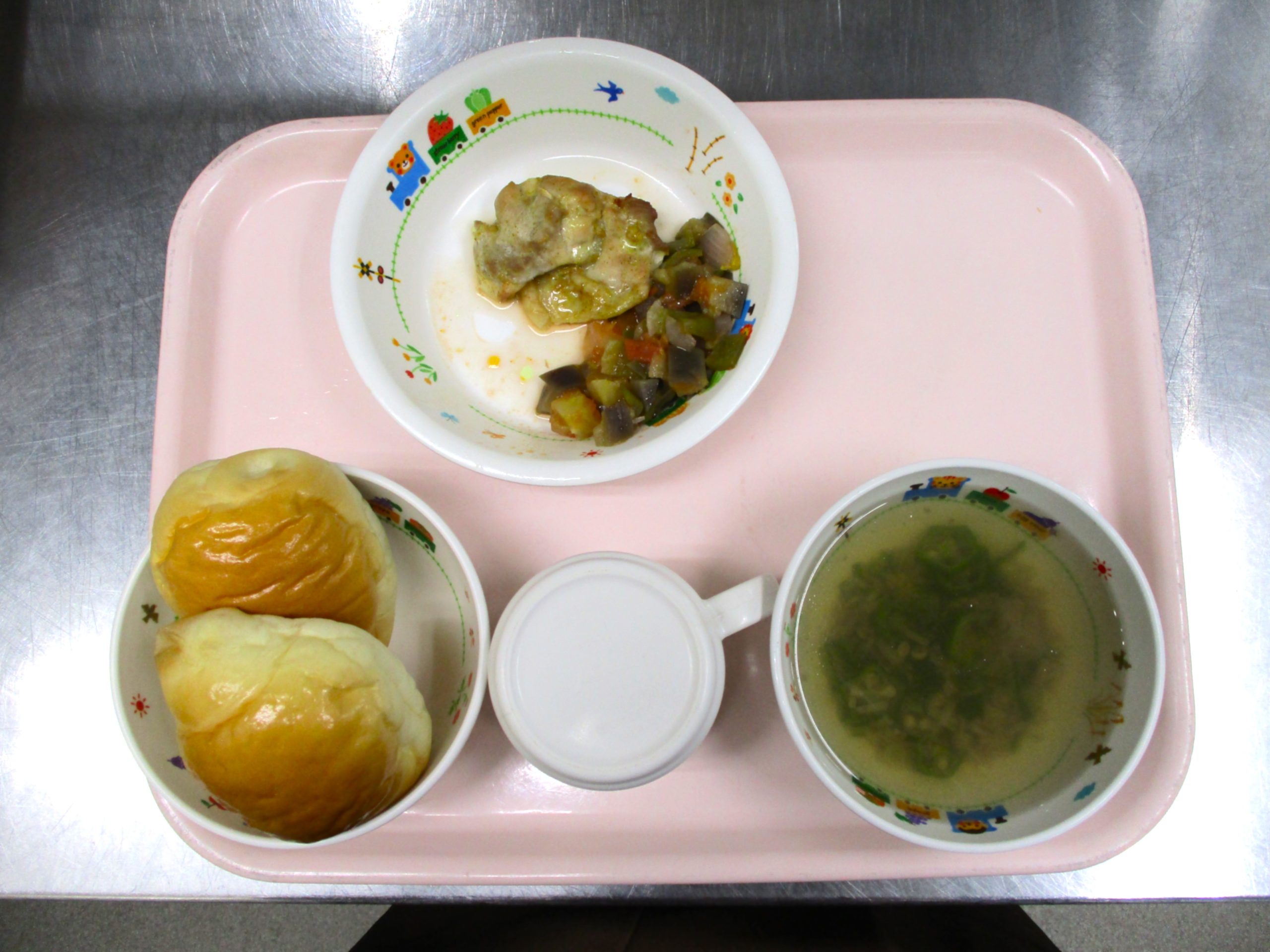 2024.08.02 鶏肉のカレーマリネ🥕🍗 大宮たんぽぽ保育園 今日の給食 ロールパン🥖オクラのスープ🍜鶏肉の🍛カレーマリネ🍽️ラタトゥイユ いただきます。 -