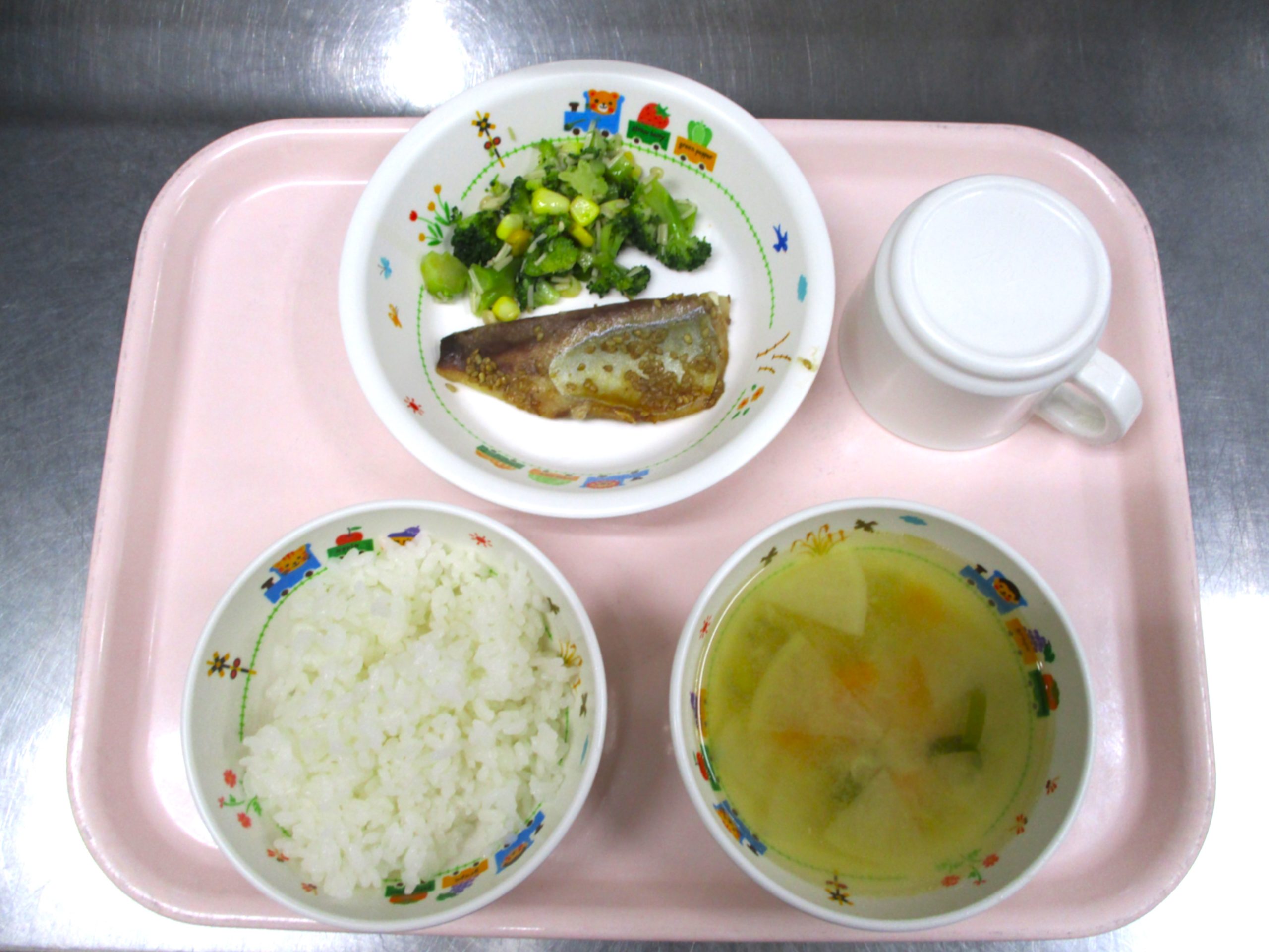 2024.08.05 アジのかば焼き🐟 大宮たんぽぽ保育園 今日の給食 🍚ごはん🍜具だくさん汁🐟あじのかば焼き🥦ブロッコリーのサラダ🥗 いただきます -