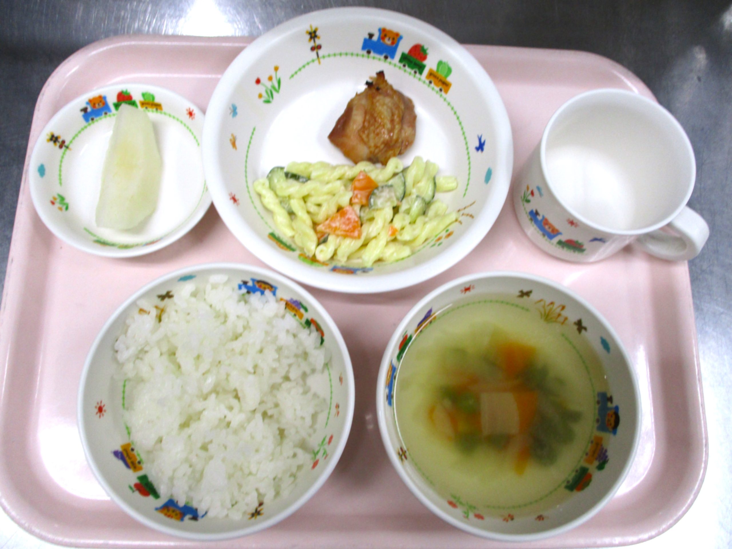 2024.08.07 BBQチキン 大宮たんぽぽ保育園 今日の給食 🍚ごはん🍲コンソメスープ🍗BBQチキン🥗マカロニサラダと 伊奈産の梨『幸水』のデザート付 いただきます。 -