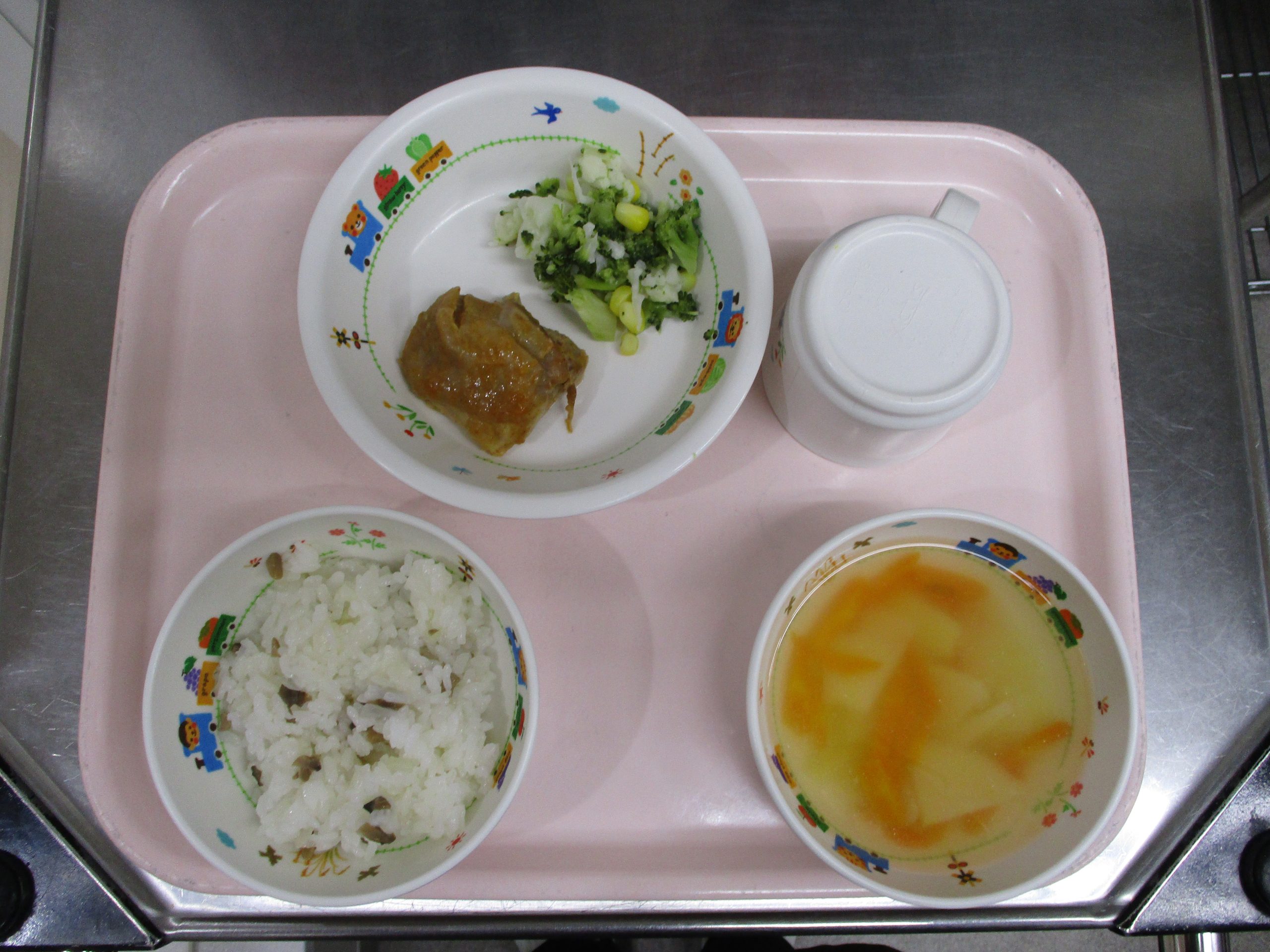 2024.07.12 ピラフ🥕 大宮たんぽぽ保育園 今日の給食 ピラフ🍚 コンソメスープ🧅 タンドリーチキン🍗 フレンチサラダ🥗 いただきます。 -