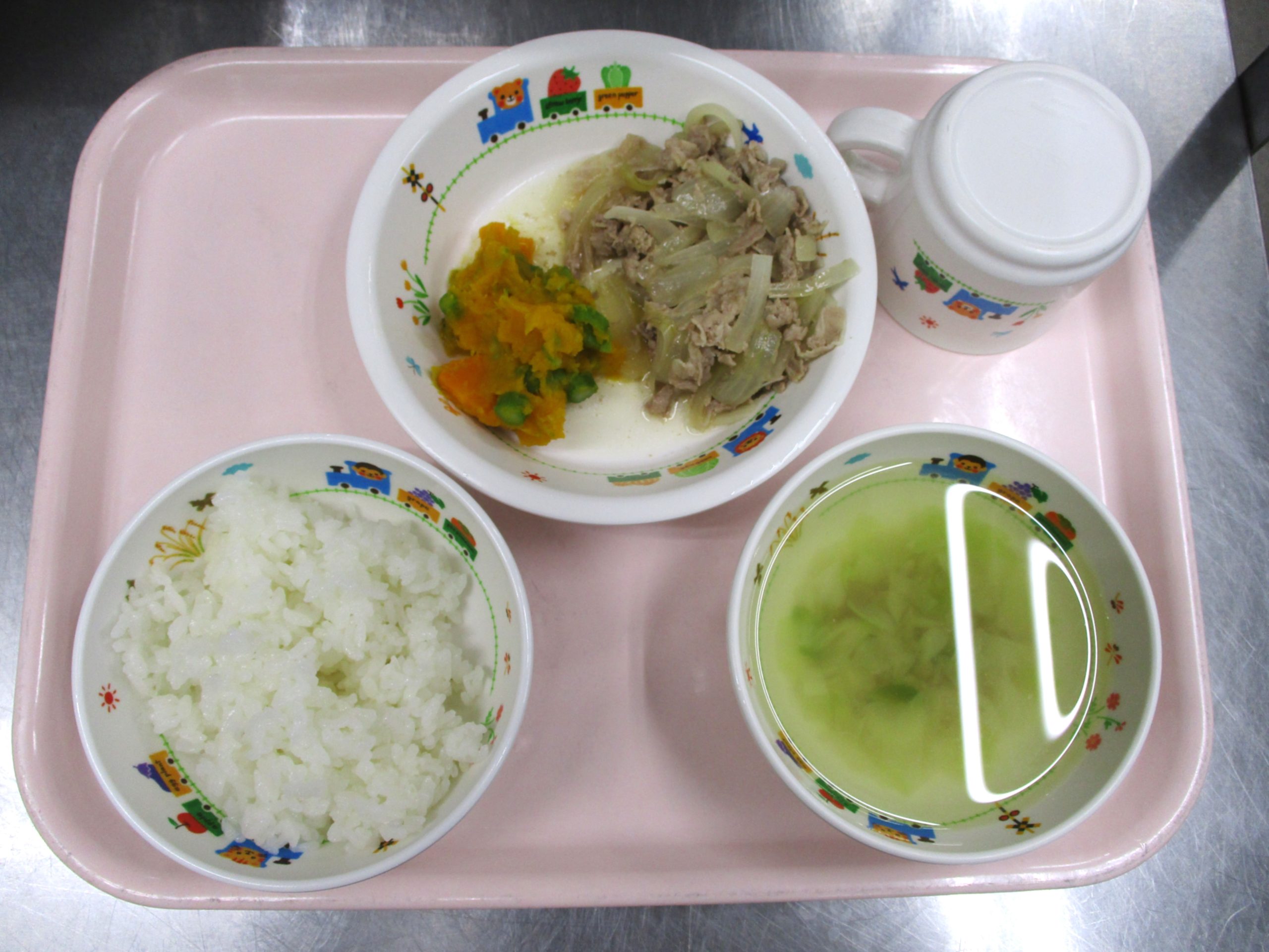 2024.07.04 ポークソテー🧅🥕 大宮たんぽぽ保育園🌈 今日の給食 🍚ごはん🥬キャベツの塩スープ🥩ポークソテー🥗アスパラサラダ いただきます。 -