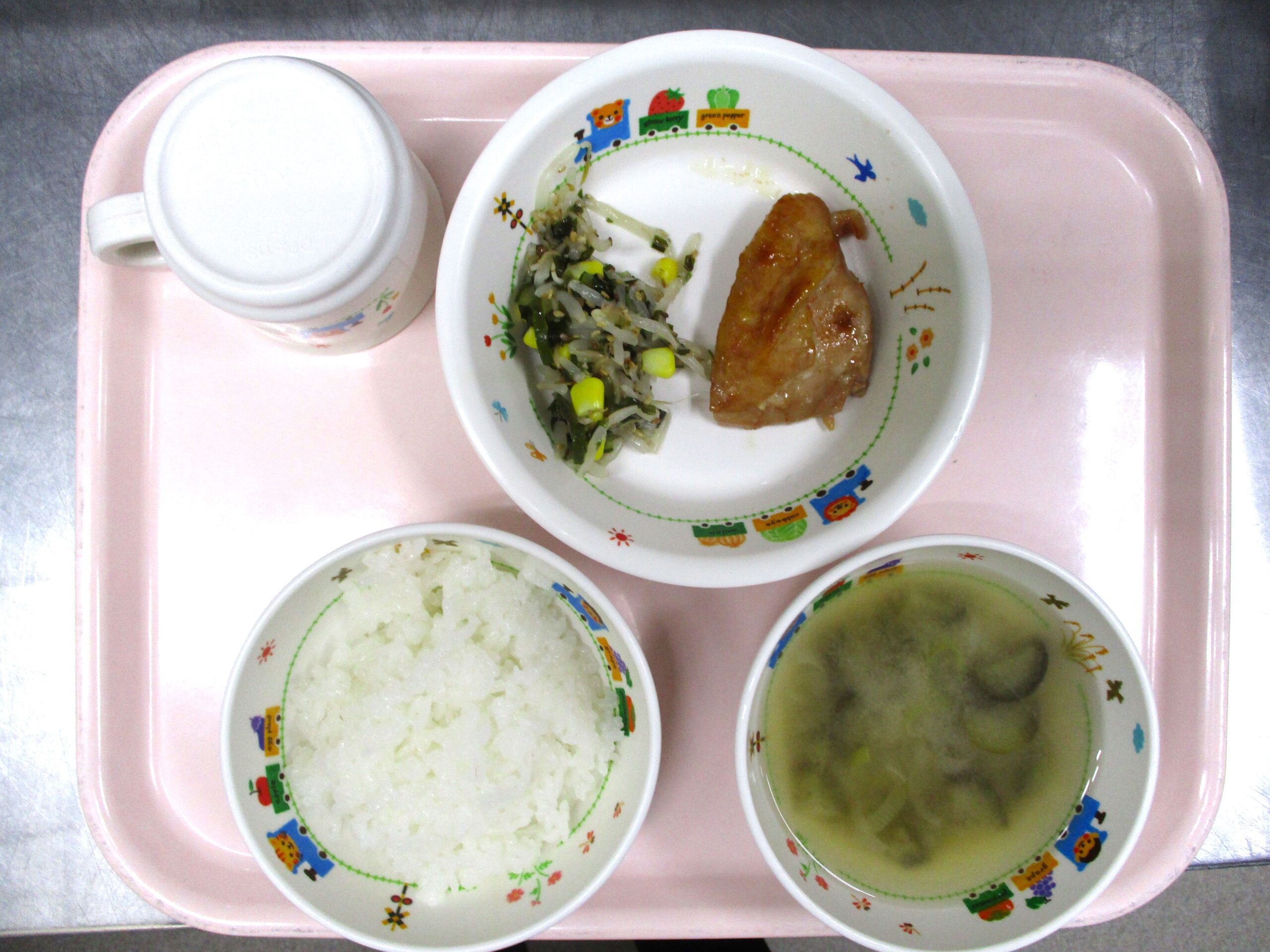 2024.04.23 大宮たんぽぽ保育園🌈バーベキューチキン🍗 さいたま市北区 大宮たんぽぽ保育園 今日の給食 🍚ごはん🍜みそ汁🍗バーベキューチキン🥬ワカメサラダ🥗 いただきます。