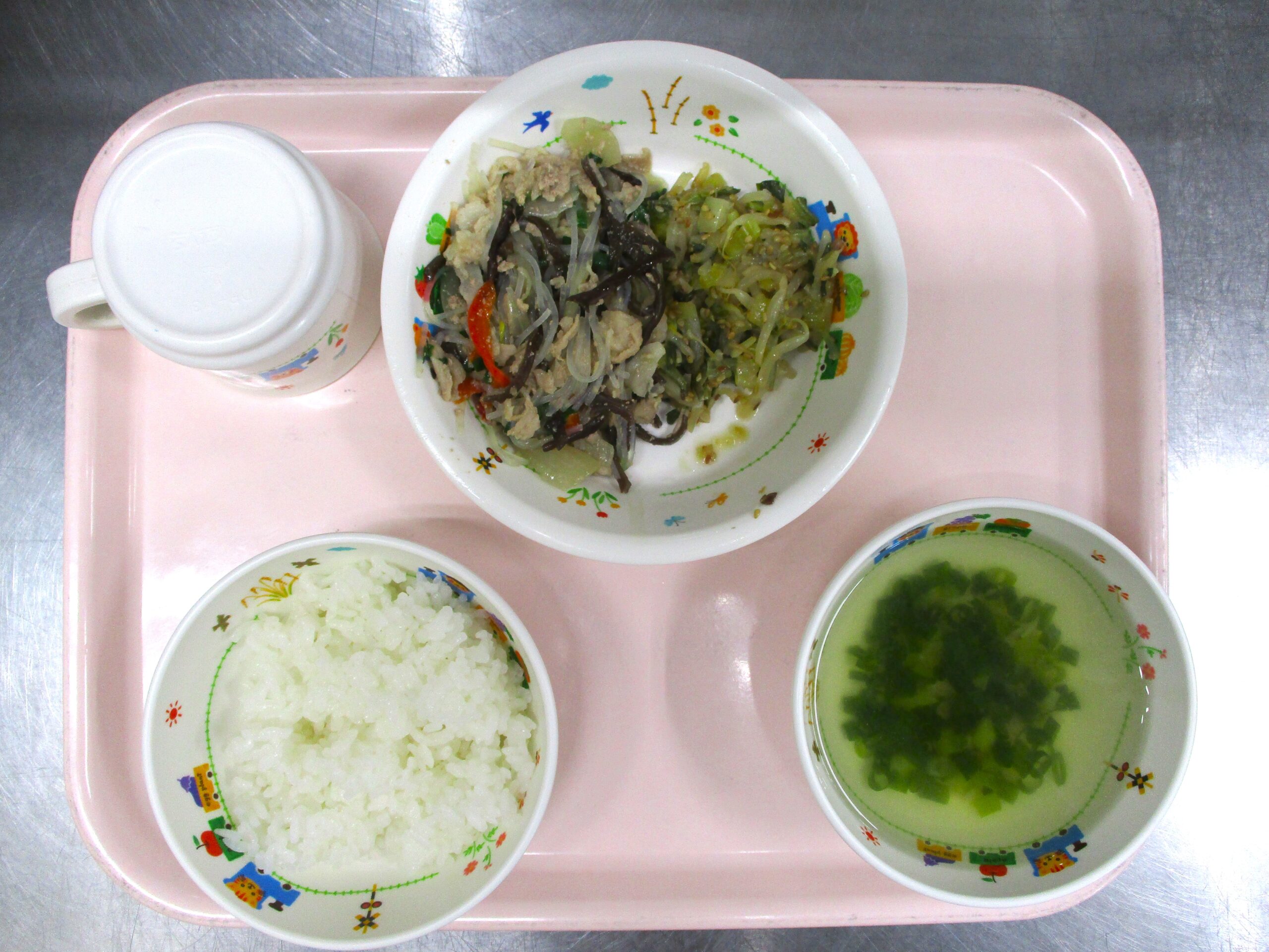 2024.04.25 大宮たんぽぽ保育園🌈 豚肉と春雨の炒め物 さいたま市北区 大宮たんぽぽ保育園🌈 今日の給食 🍚ごはん🍲スープ🍗豚肉と春雨の炒め物🥬チンゲン菜のナムル いただきます。 -