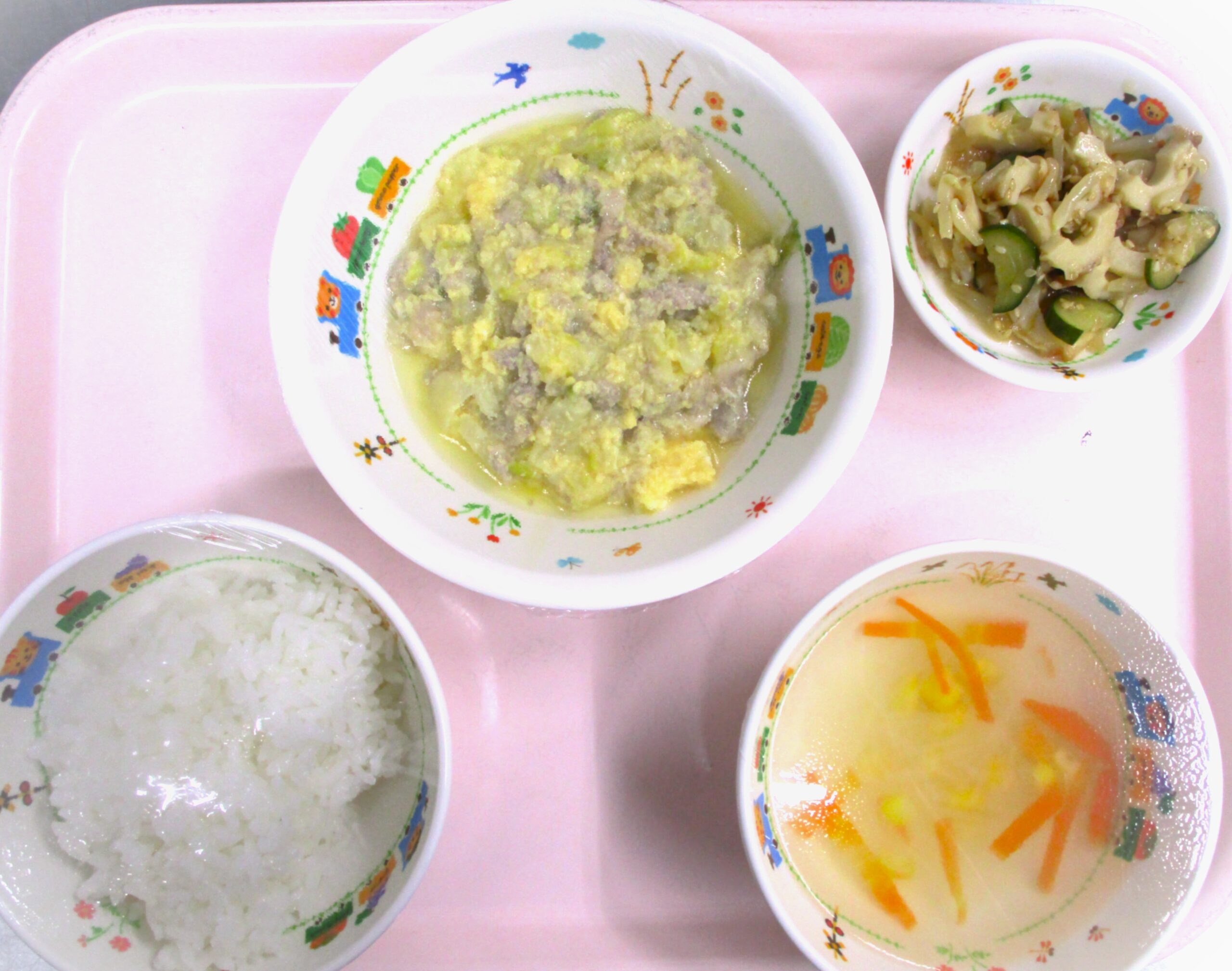 2026.01.21 豚肉と🥬白菜の煮物 🏫大宮たんぽぽ保育園 🌈今日の給食 🍚ごはん🍚 春雨スープ 豚肉と白菜の煮物 きゅうりと竹輪の和え物 いただきます。 -