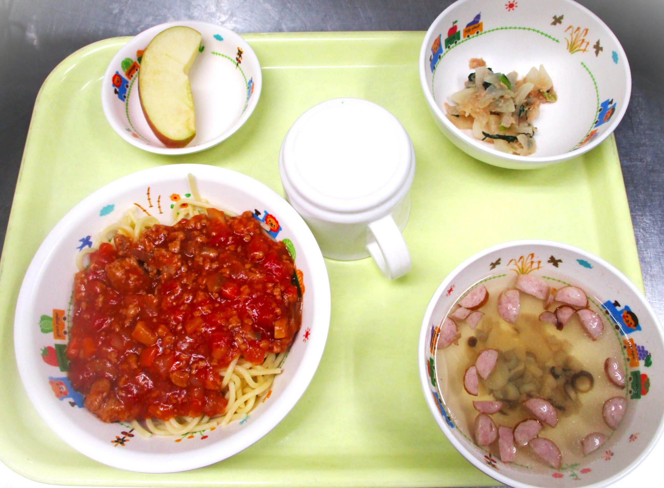 2026.01.22 🍝ミートソーススパゲティ🍴 🌈大宮たんぽぽ保育園 🏫今日の給食 🍴ミートソーススパゲティ🍝 しめじのスープ🍲 大根とツナの🥗サラダ 🍎りんご🍎 いただきます。 -