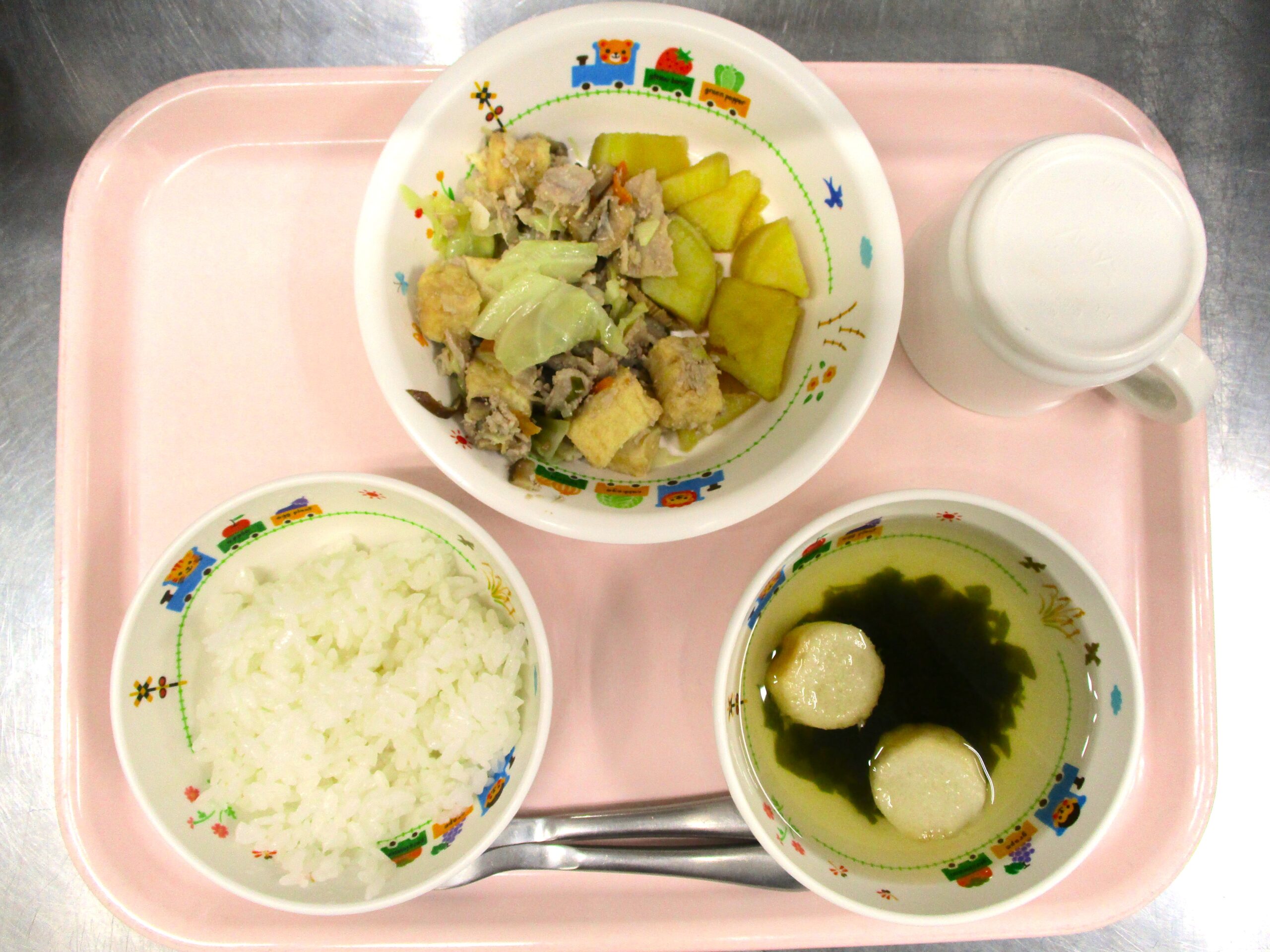 2024.01.17 豚肉と生揚げの炒め物🍴 大宮たんぽぽ保育園🌈 今日の給食 🍚ごはん🍲すまし汁🐖豚肉と生揚げの炒め物🍠さつまいもの甘煮 いただきます。 -