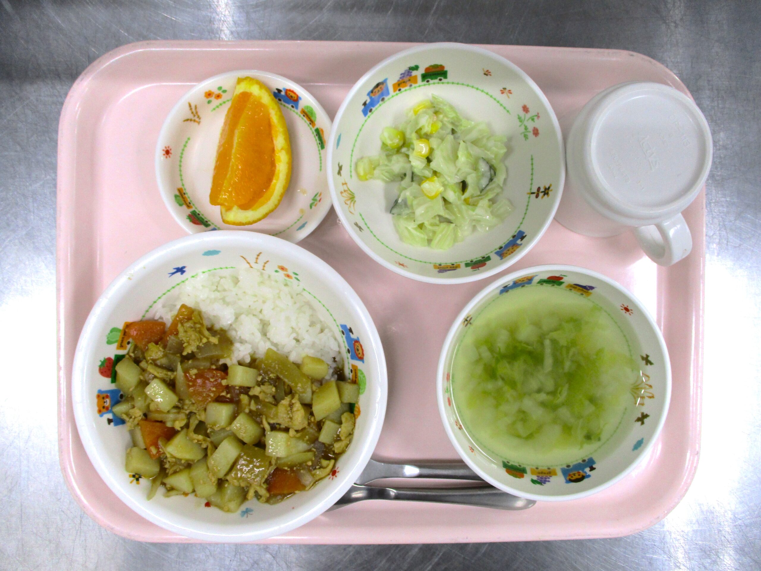2024.01.18 チキンカレー 大宮たんぽぽ保育園🌈 今日の給食🍴 🍛チキンカレー 🍲はくさいスープ 🥗コールスローサラダ 🍊オレンジ いただきます。 -
