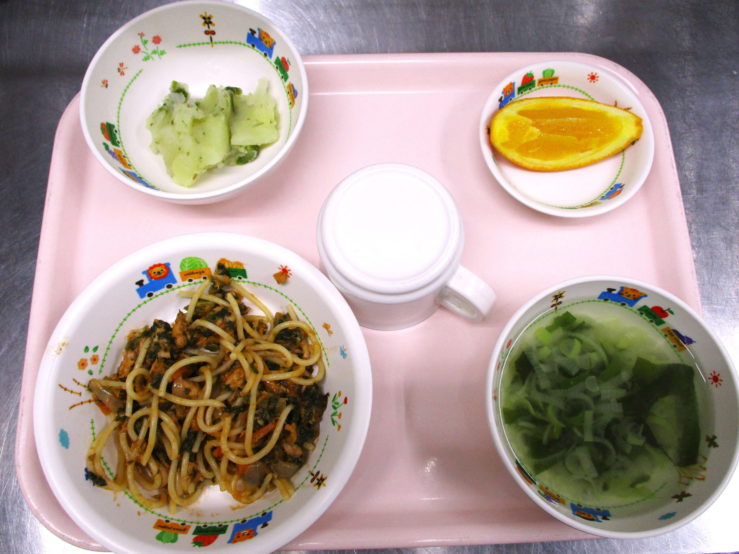 2024.01.22 今日の給食 🐟ツナナポリタン🍽️ 大宮たんぽぽ保育園🌈 園内で作ったおいしい今日の給食 🐟ツナナポリタン🍜わかめスープ🥔ジャガイモのソテー🍊オレンジ いただきます。 -