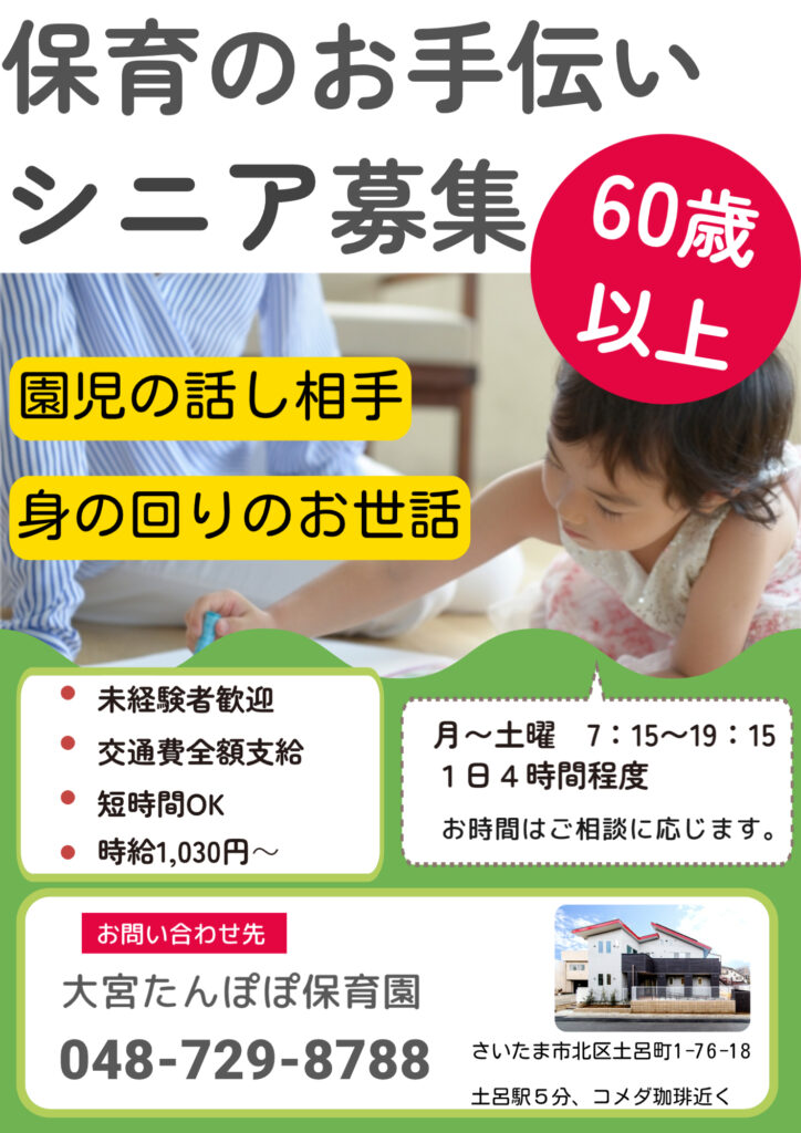 保育のお手伝いシニア募集! 2023.11.16 保育のお手伝いできる方!募集しております。 お気軽にお問合せください。 ◀ 前へ | お知らせ 一覧 | 次へ ▶ 関連記事 2026.04.07保育園見学について【5月・6月】 2026.02.19大宮たんぽぽ保育園 お遊戯会✨ 2025.10.17お芋掘り遠足🍠 2025.10.14保育園見学について【11月】 お知らせ